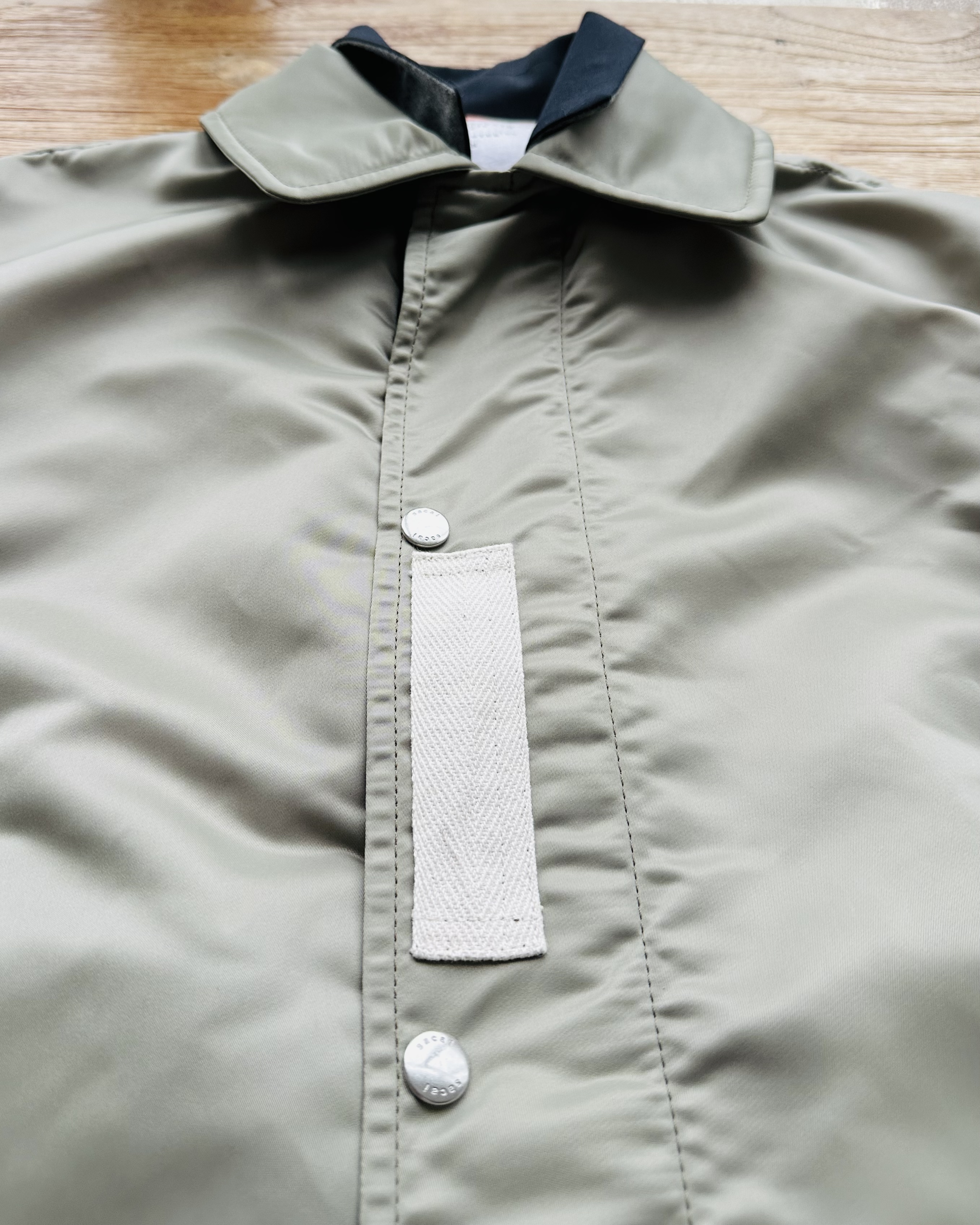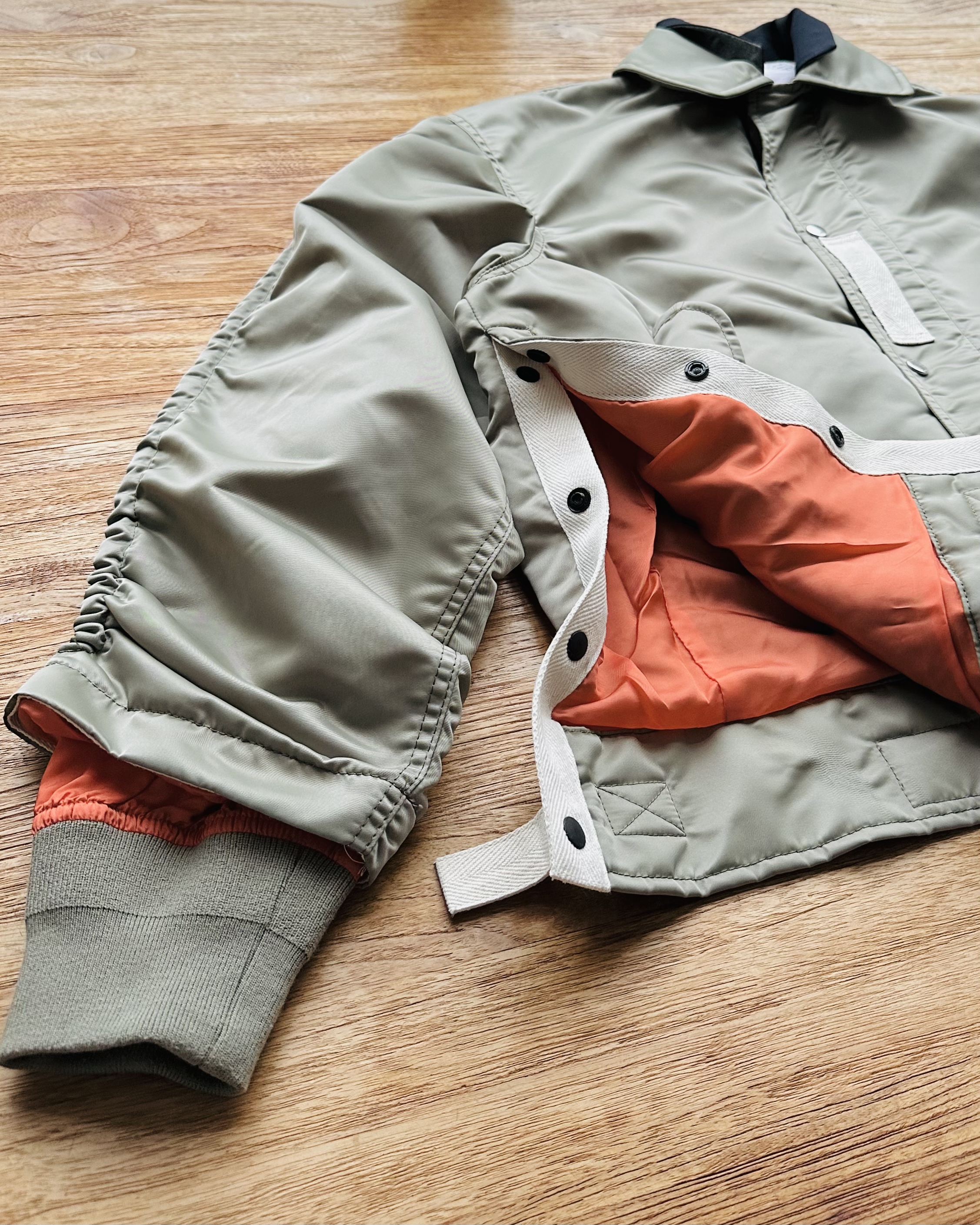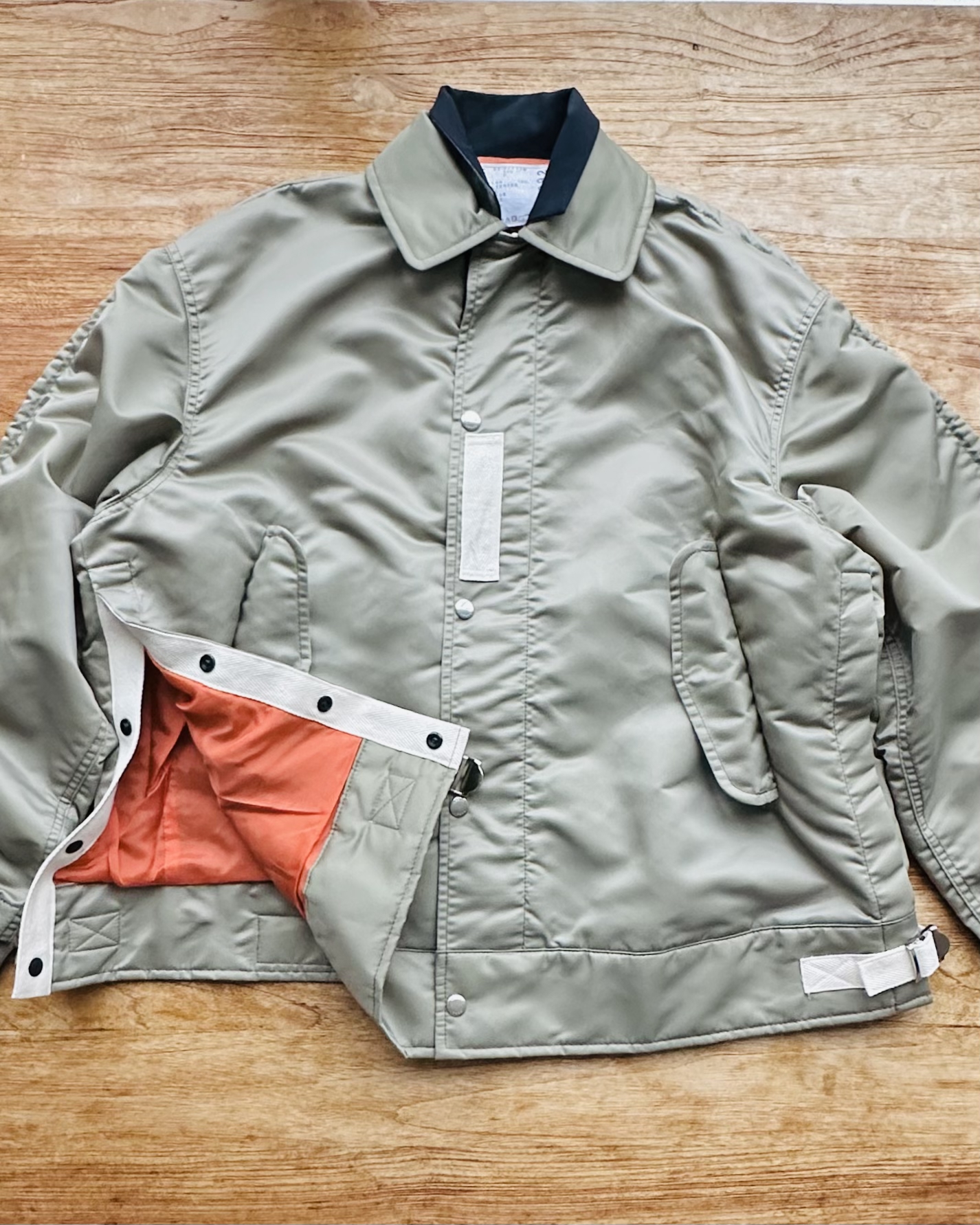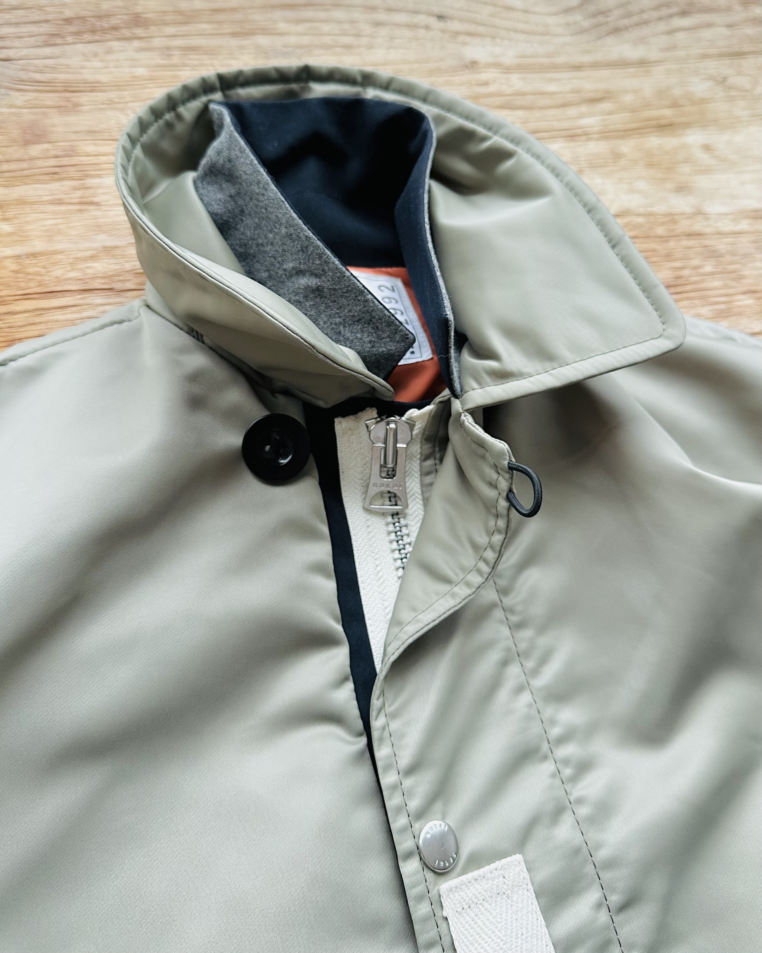 咪癲啦!2023年原價~HK$8K嘅layered軍褸變種喎!和風入饌靚到咁喎🎎!No bullshit let’s go🦍 價錢:HK$2,700 品牌:Sacai 尺碼:2 / S-M 尺寸:54cm (drop shoulder)|130cm (胸-buttoned)|65cm (袖)|69cm (長) 註:85%新|左袖背有淡黑漬|100% nylon|70% polyester + 30% wool|50% cotton + 50% polyester|100% cupro (底)|日本製 *二手產品難達全新狀態,耗損或歲月痕跡屬正常情況,較明顯/嚴重嘅問題會標明或影底,敬請見諒。 *進入付款程序後,請於10分鐘內完成付款,否則絲統會自動取消訂單。 逢星期四寄出|不設退換或退款|順豐運費到付|只寄香港不寄海外