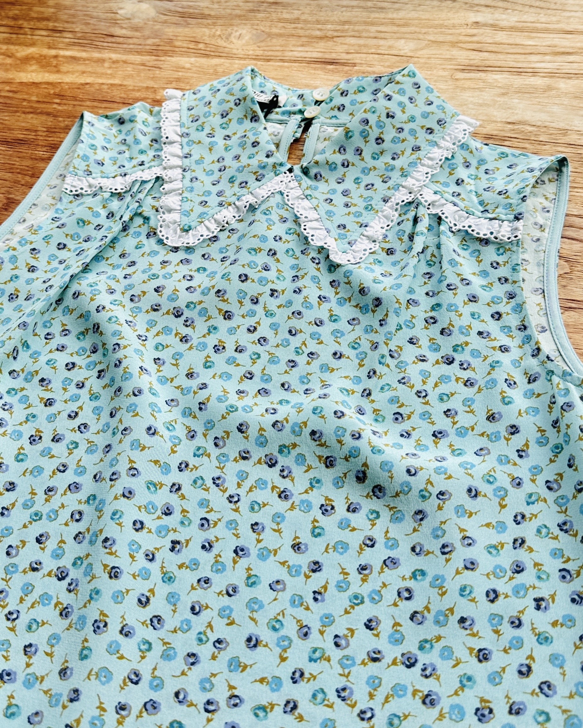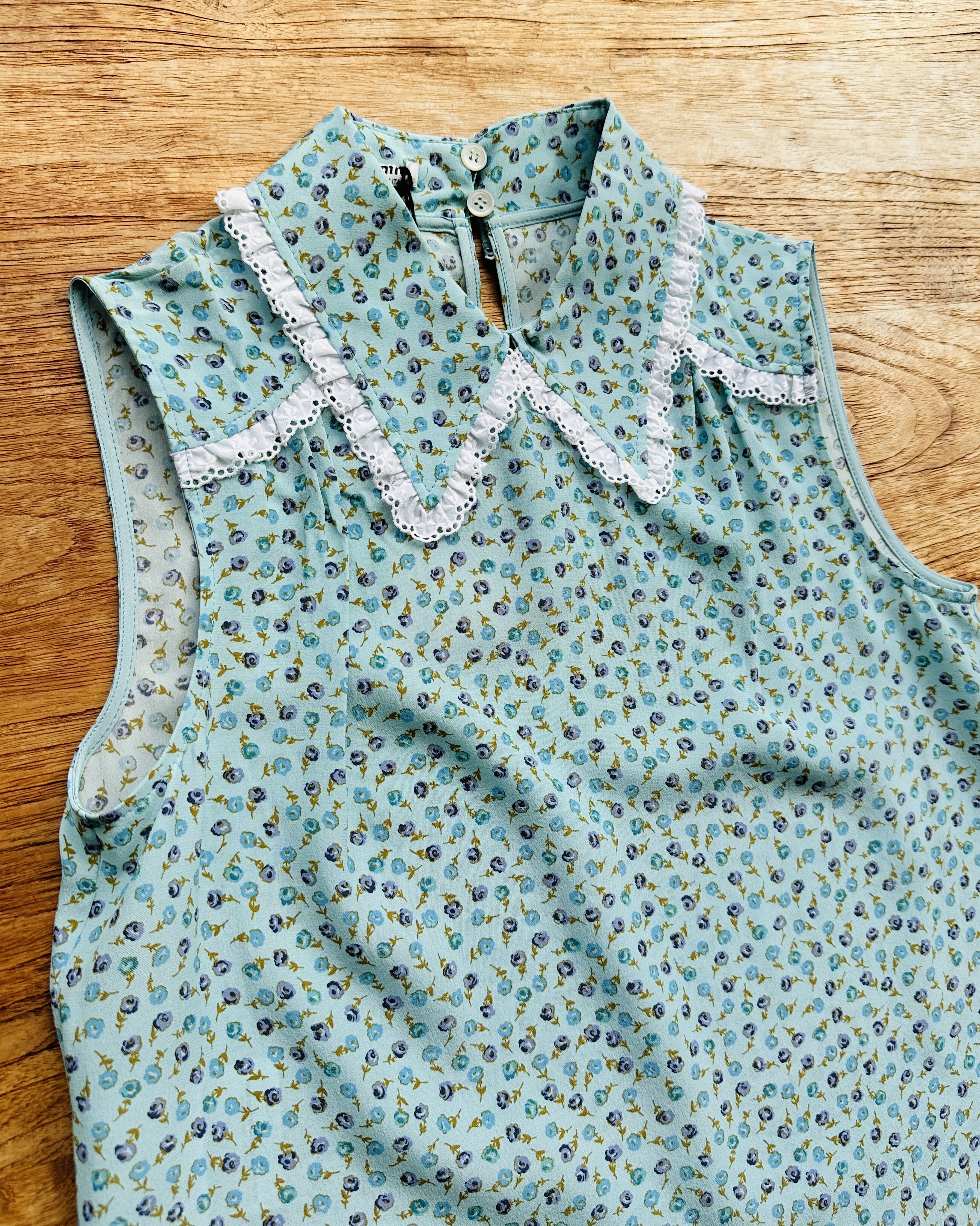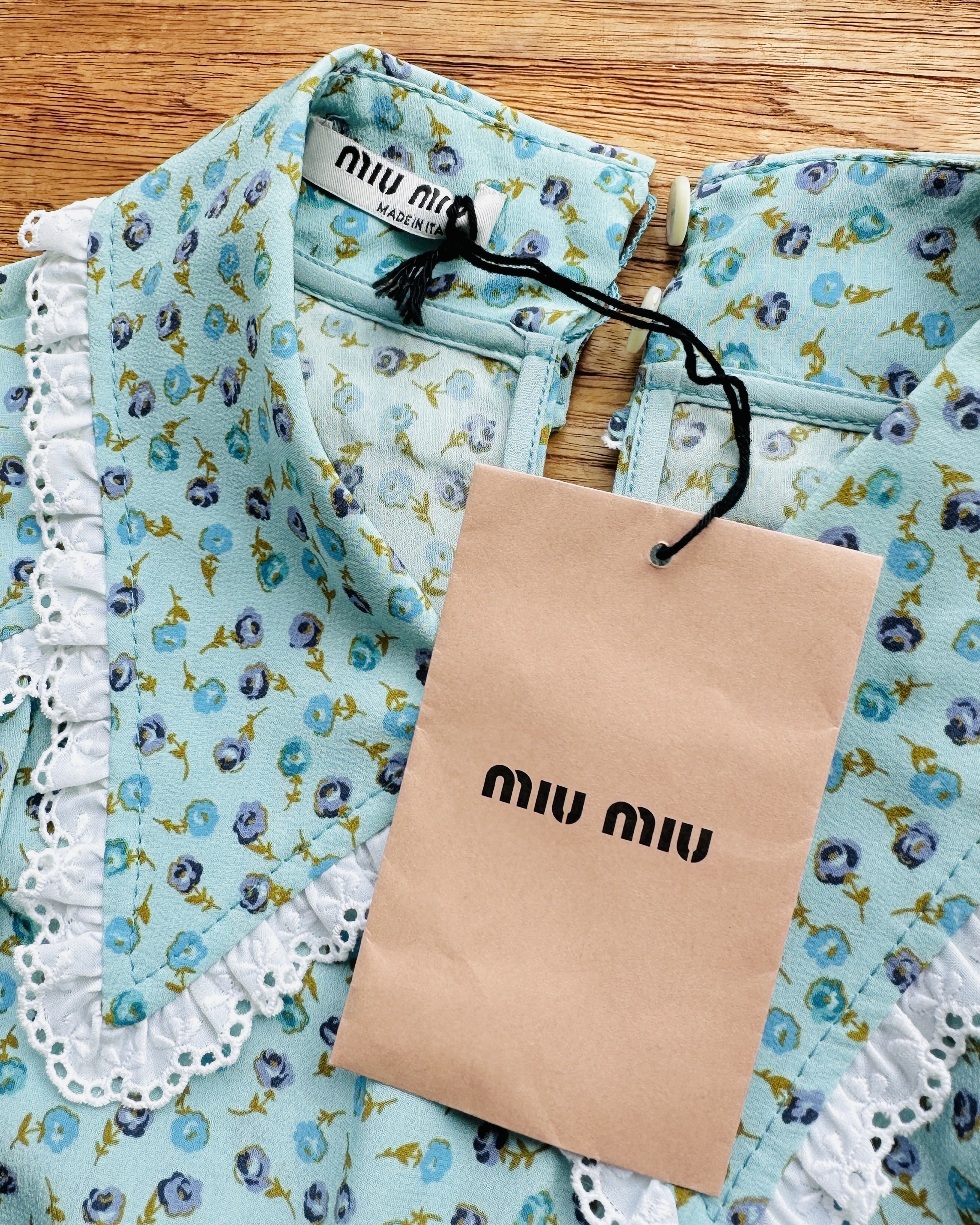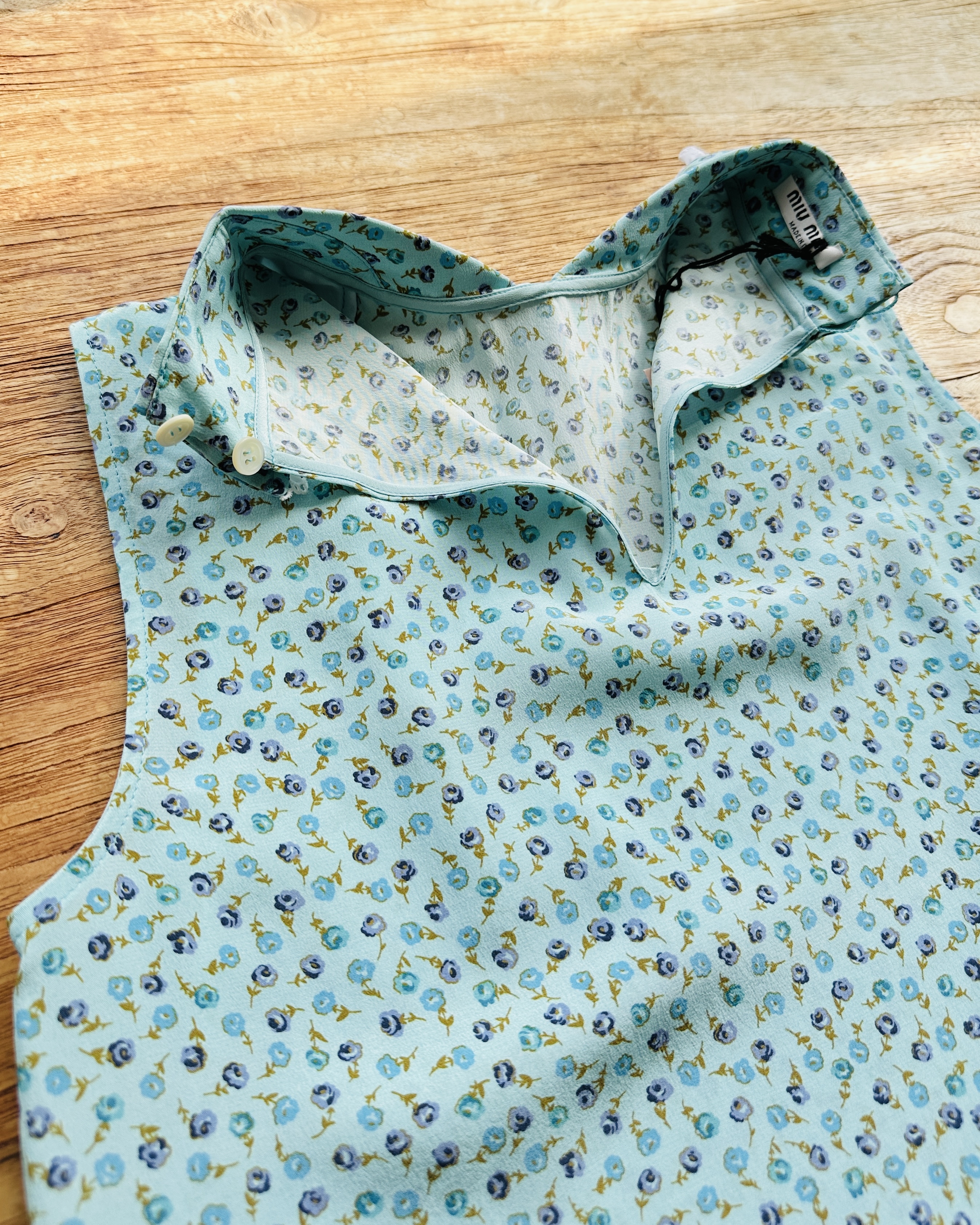 係咪已經開始認得呢種剪裁啦?阿妙招牌冇袖blouse。今次呢件2017 出品玩到真絲啦喎,鍾意碎花嘅妹豬快啦🏃🏻♀️💨 價錢:HK$1,300 品牌:miu miu 尺碼:IT 38 / 165/76A / S 尺寸:33cm (肩)|86cm (胸)|88cm (腰)|63cm (長) 註:全新未剪牌|100% silk|100% cotton|意大利製 *二手產品難達全新狀態,耗損或歲月痕跡屬正常情況,較明顯/嚴重嘅問題會標明或影底,敬請見諒。 *進入付款程序後,請於10分鐘內完成付款,否則絲統會自動取消訂單。 不設退換或退款|順豐運費到付|只寄香港不寄海外