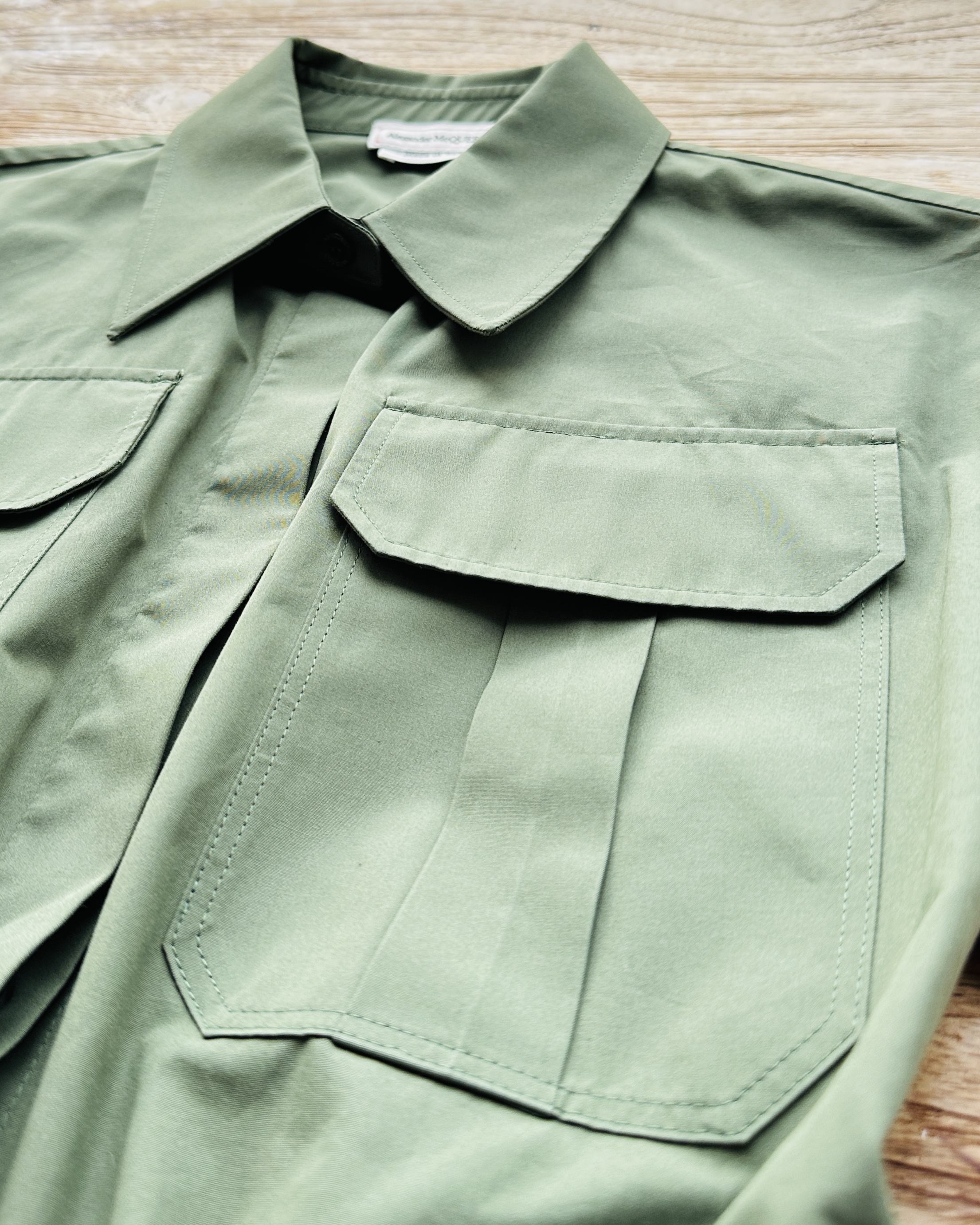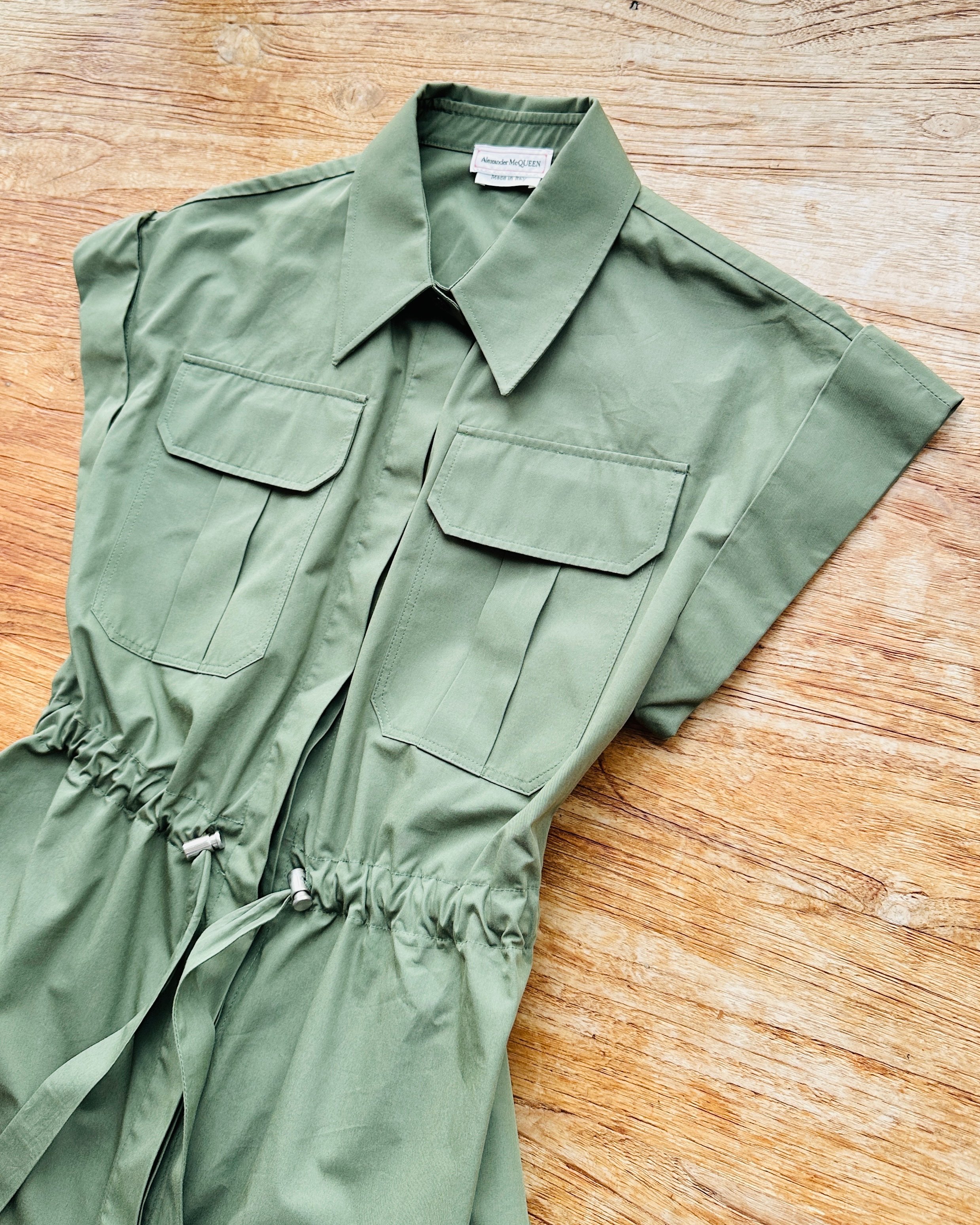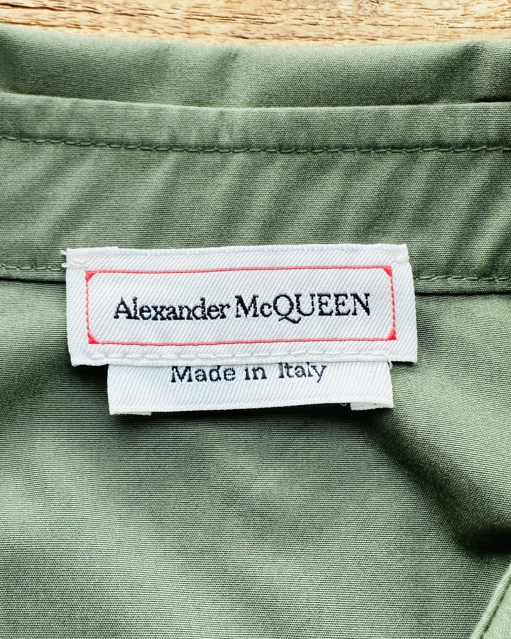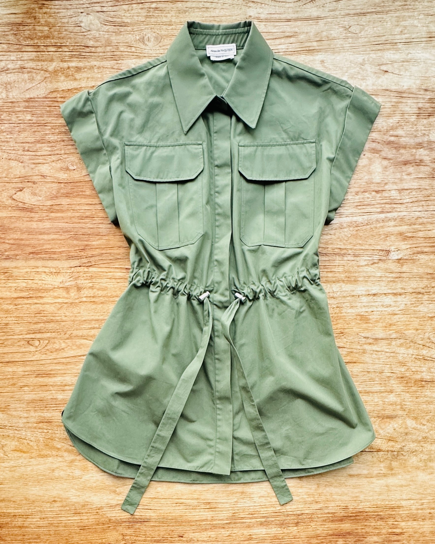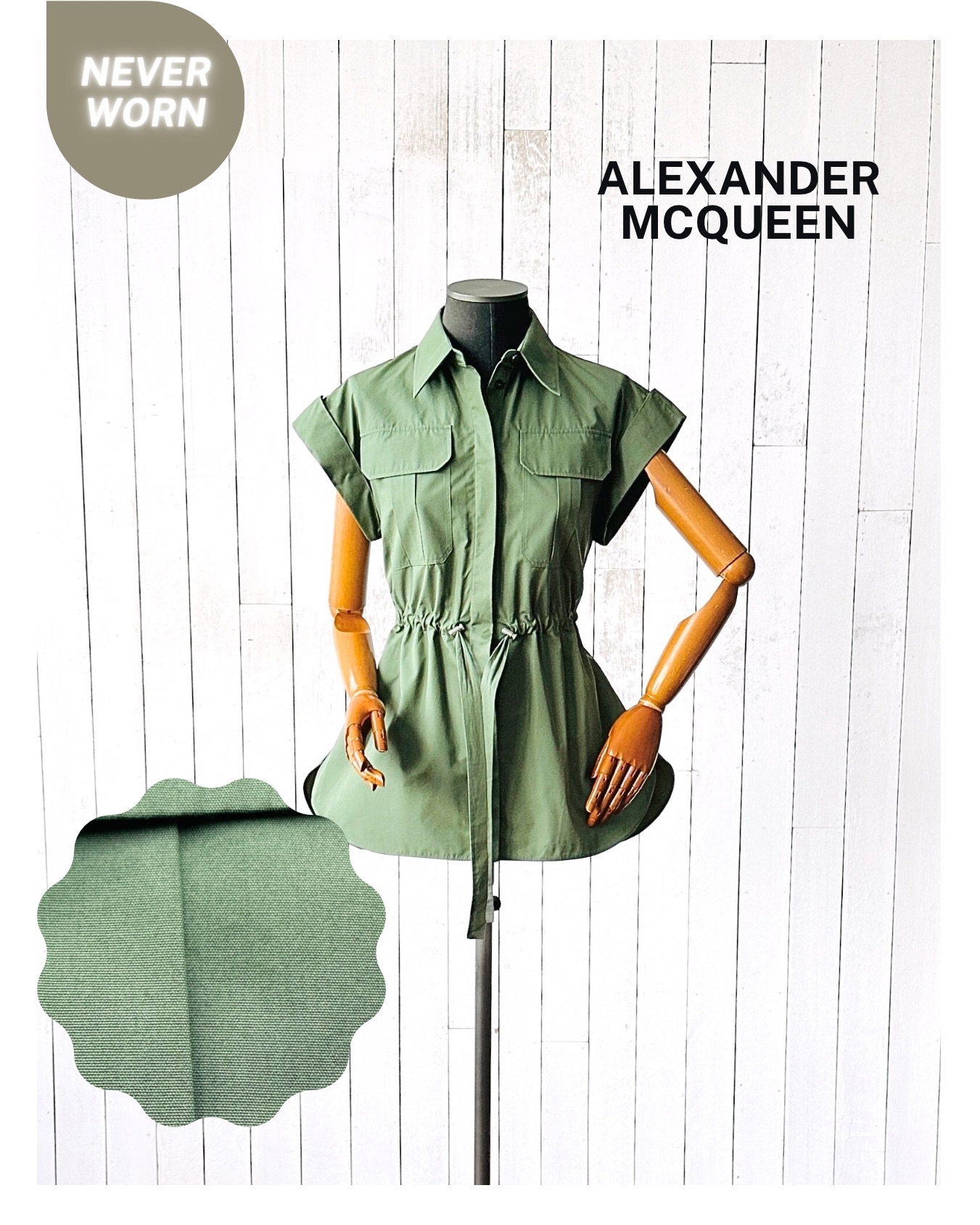時裝界最靚嘅漏斗cut只有地拖同Mcqueen⏳;前者通常透過bar jacket展現,後者幾乎滲透每件上衫,例如呢件咁挺身工整又有建築感嘅,肯定係McQueen㗎啦。2021秋冬嘅,原價HK$7K🧚🏼♀️ 價錢:HK$1,400 品牌:Alexander McQueen 尺碼:IT 36 / 155/80A / XS-S 尺寸:55cm (drop shoulder)|86cm (胸)|76cm (腰-可索緊)|49cm (長) 註:全新未使用|背面衫領淡熨斗印| 100% cotton|意大利製 *二手產品難達全新狀態,耗損或歲月痕跡屬正常情況,較明顯/嚴重嘅問題會標明或影底,敬請見諒。 *進入付款程序後,請於10分鐘內完成付款,否則絲統會自動取消訂單。 逢星期四寄出|不設退換或退款|順豐運費到付|只寄香港不寄海外
