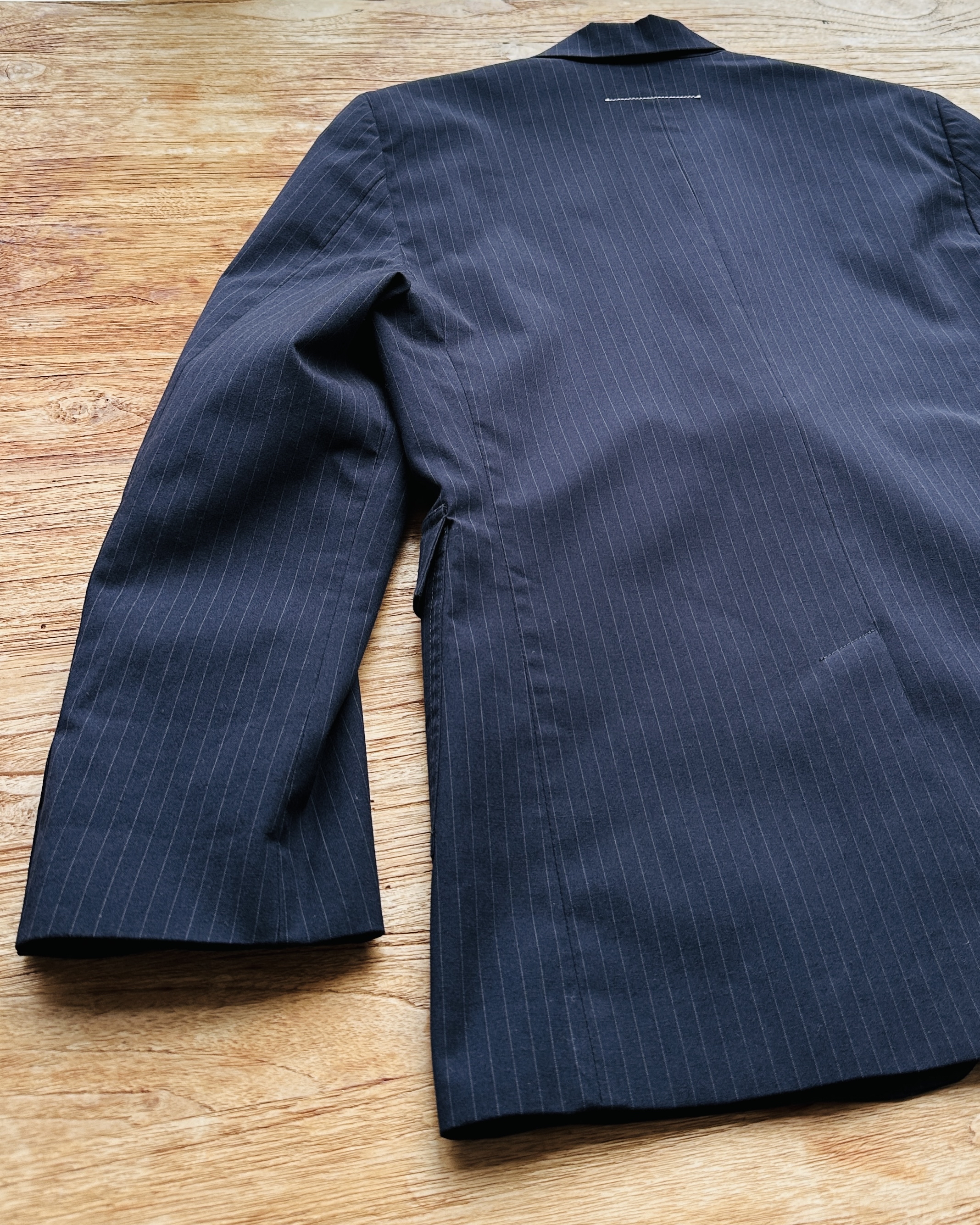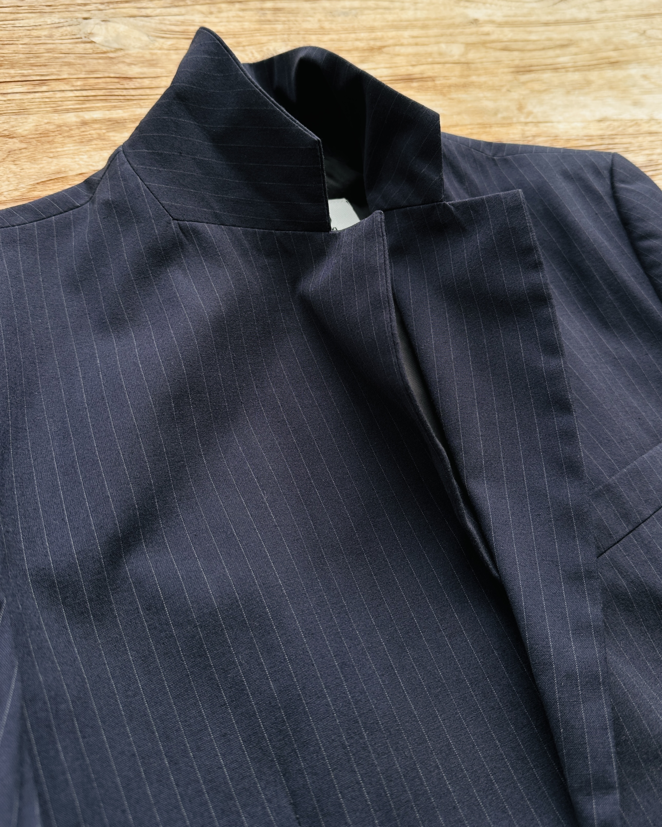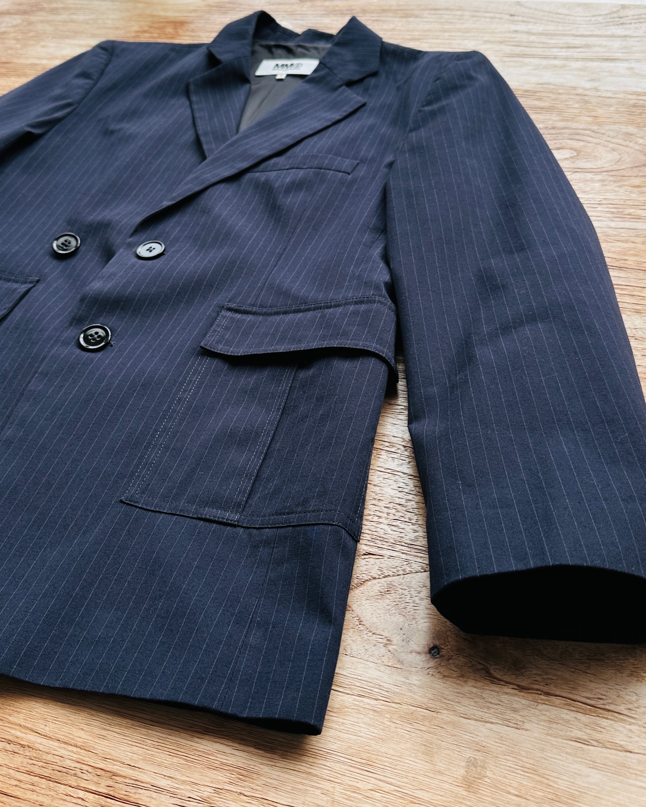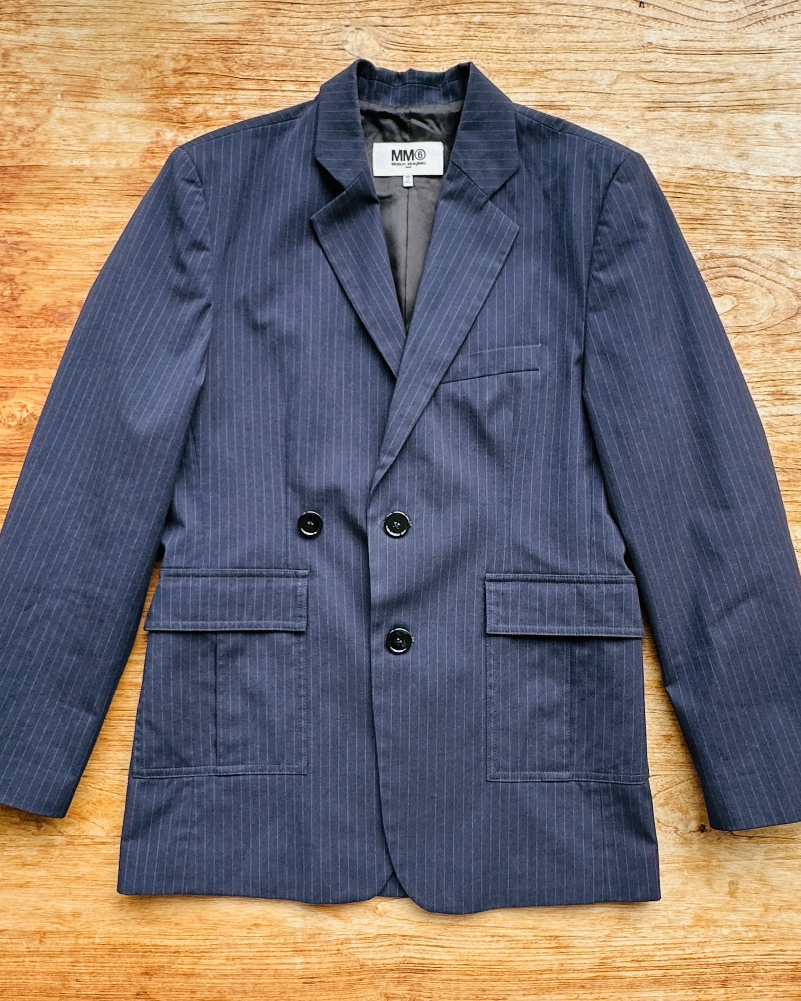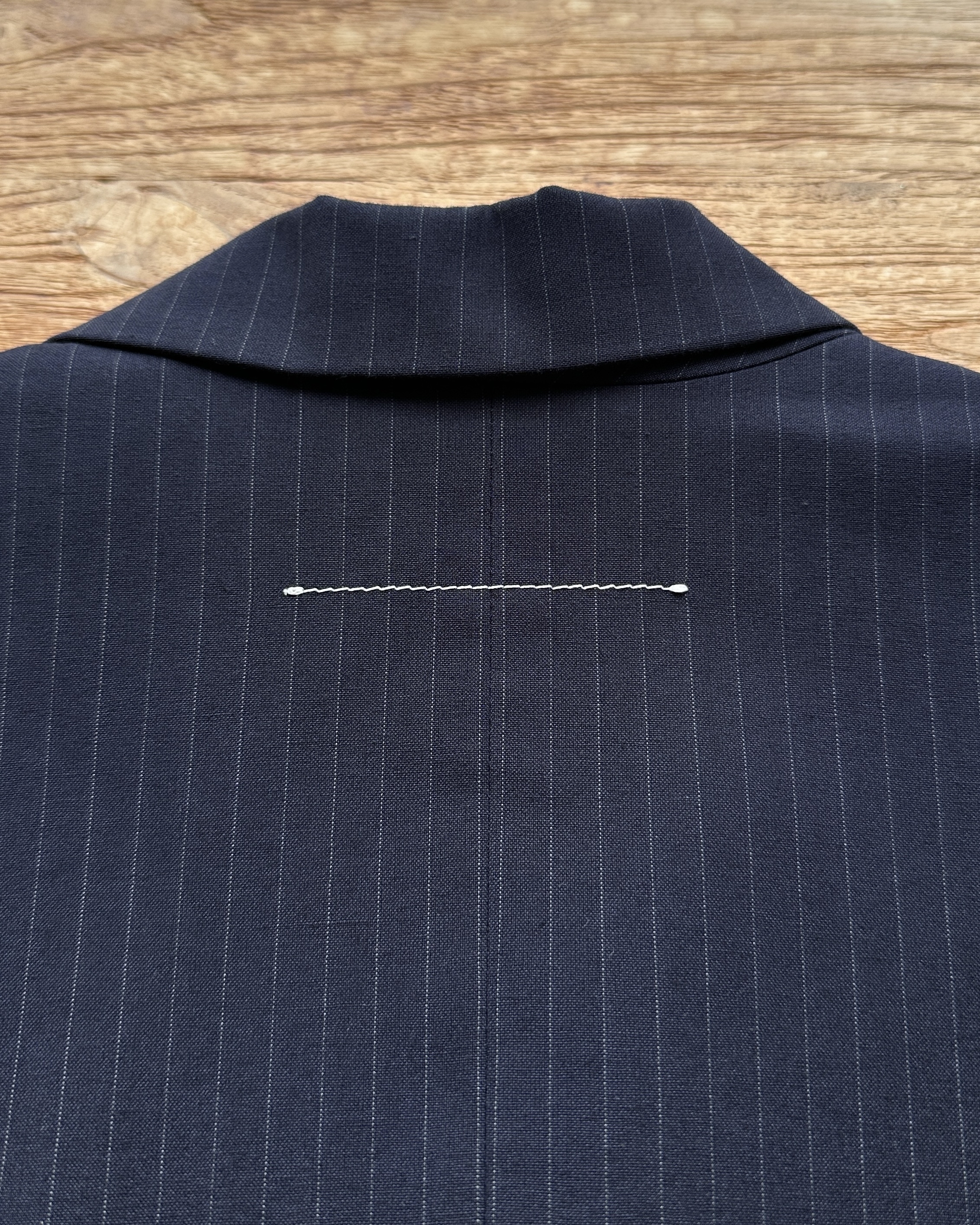 MM6經常出現嘅招牌假孖襟剪裁,呢件2022年嘅,原價HK$7K+。假孖襟勝在可以正常單襟扣鈕,但其實扣入一粒更型,你睇阿蘭幾咁招積💅🏻