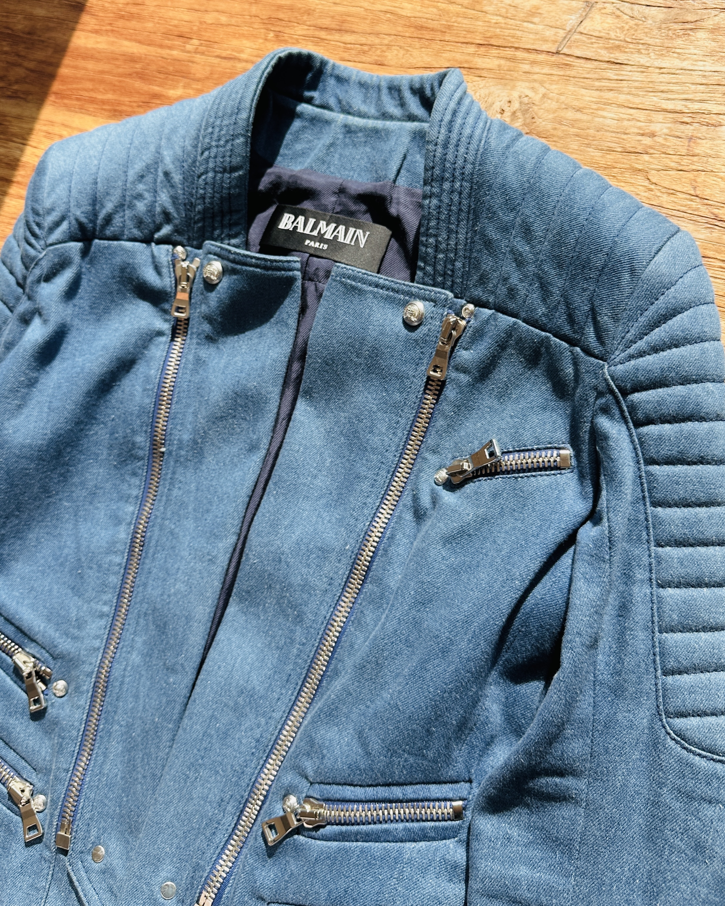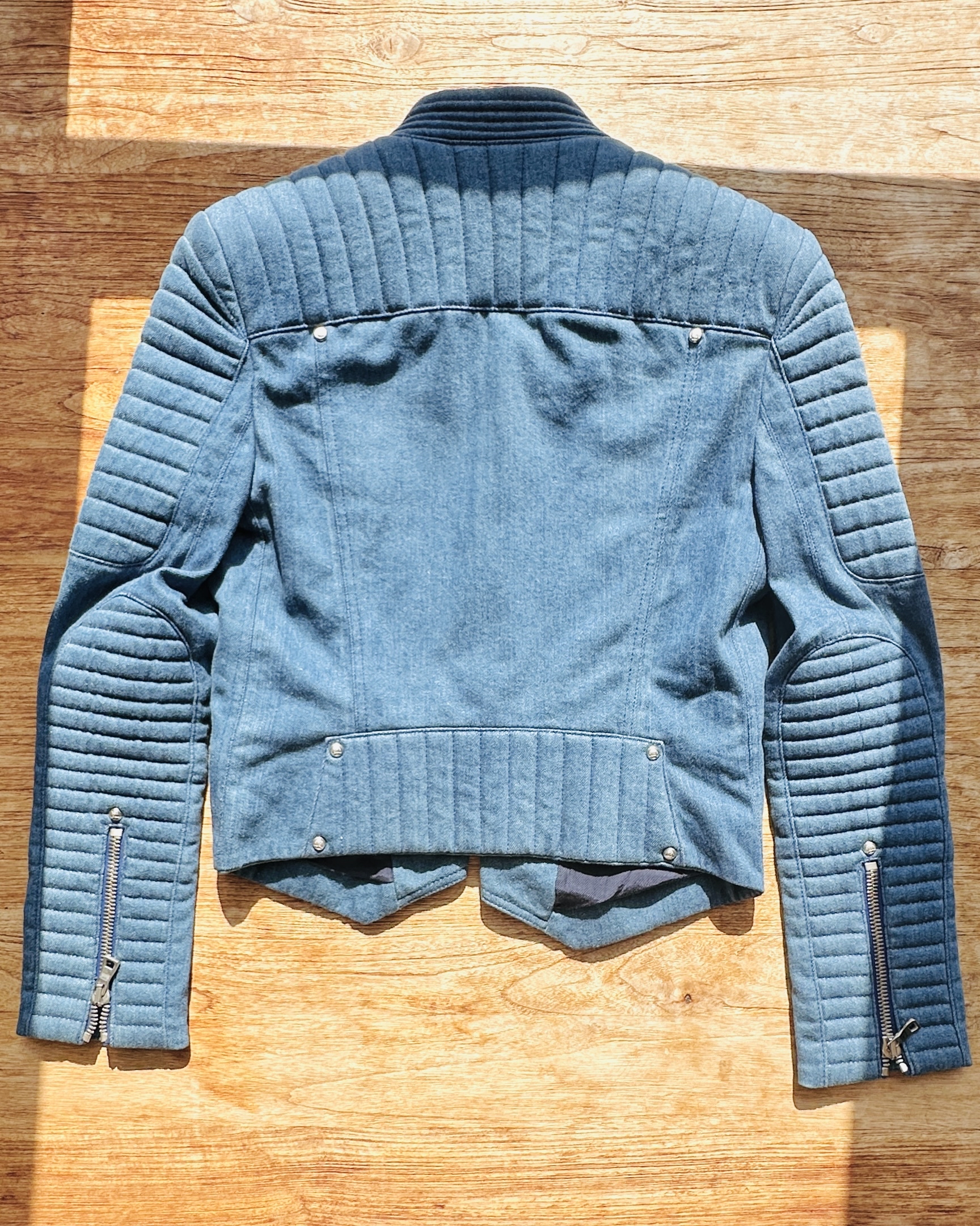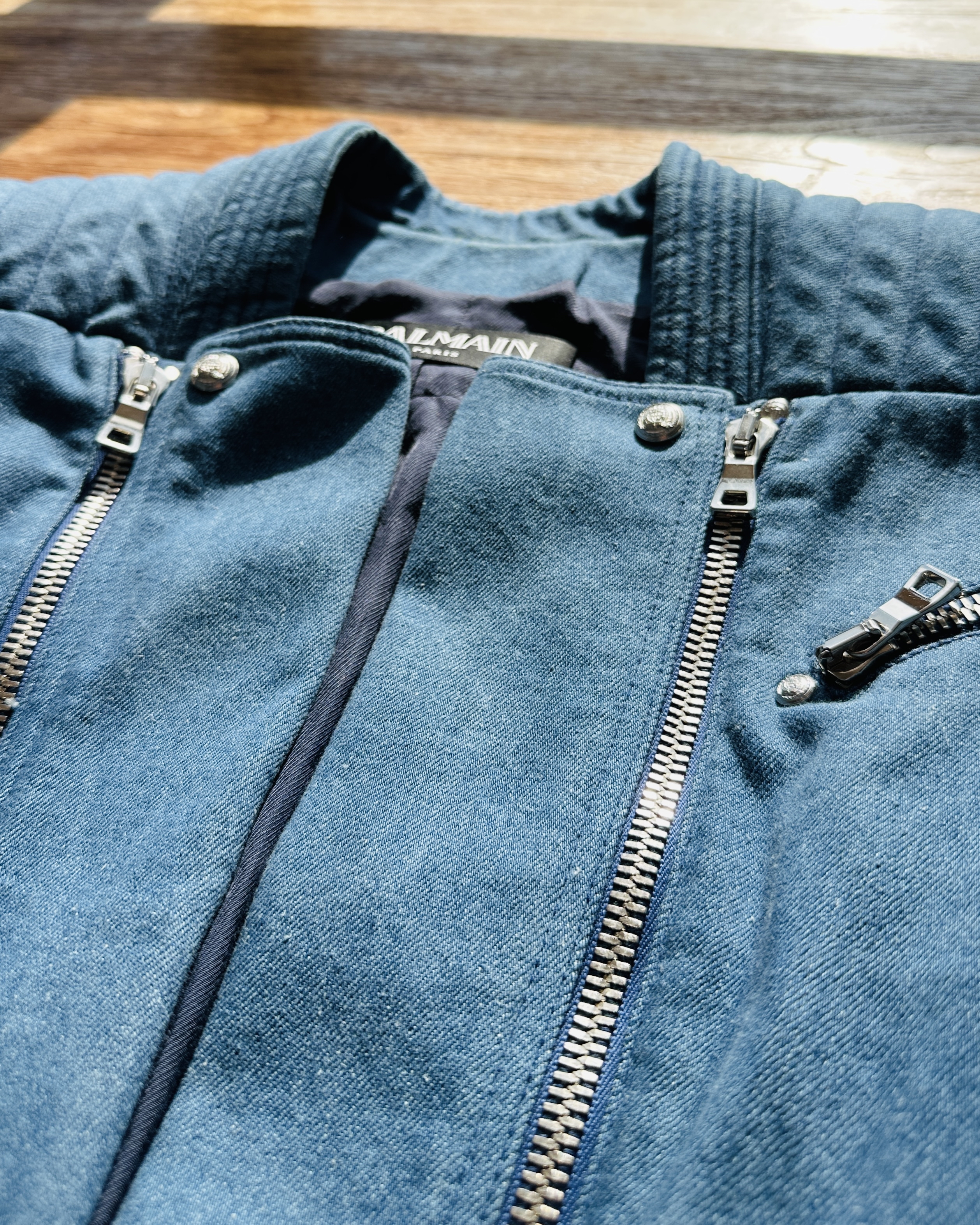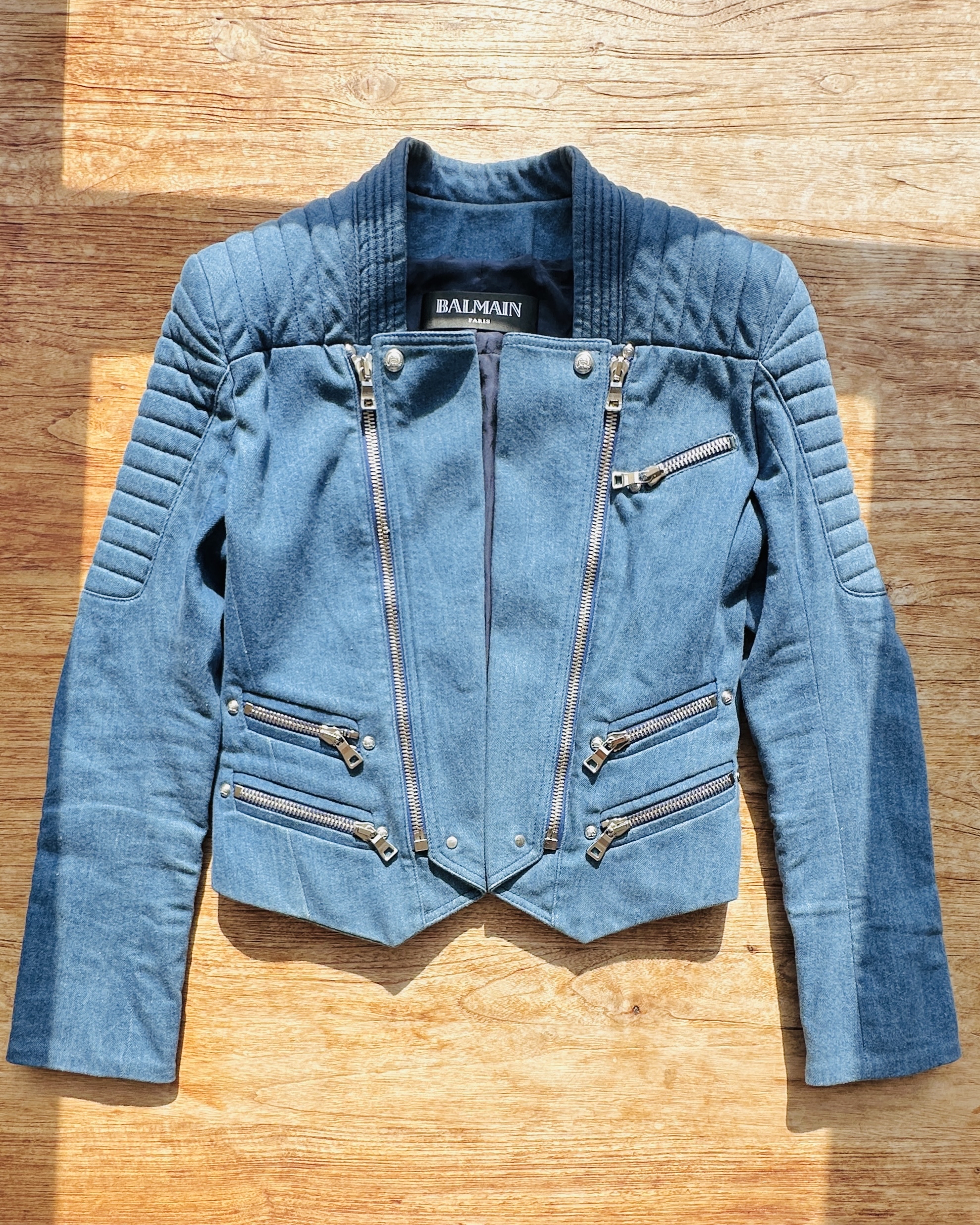 鮑姐嘅撚手biker唔係件件friendly㗎🦔!有啲膊頭個飛簷上到9樓咁高霸氣重,只適宜出現喺那英身上🐲。而呢件原價HK$19K嘅denim版就相當和藹可親嘞,着用率高好多🤭 價錢:HK$2,500 品牌:Balmain 尺碼:FR 38 / S-M 尺寸:41cm (肩)|90cm (胸-zipped)|82cm (腰-zipped)|59cm (袖)|55cm (長) 註:85%新|領內邊淡漬|98% cotton + 2% elastane|52% viscose + 48% cotton (底)|土耳其製 *二手產品難達全新狀態,耗損或歲月痕跡屬正常情況,較明顯/嚴重嘅問題會標明或影底,敬請見諒。 *進入付款程序後,請於10分鐘內完成付款,否則絲統會自動取消訂單。 逢星期四寄出|不設退換或退款|順豐運費到付|只寄香港不寄海外