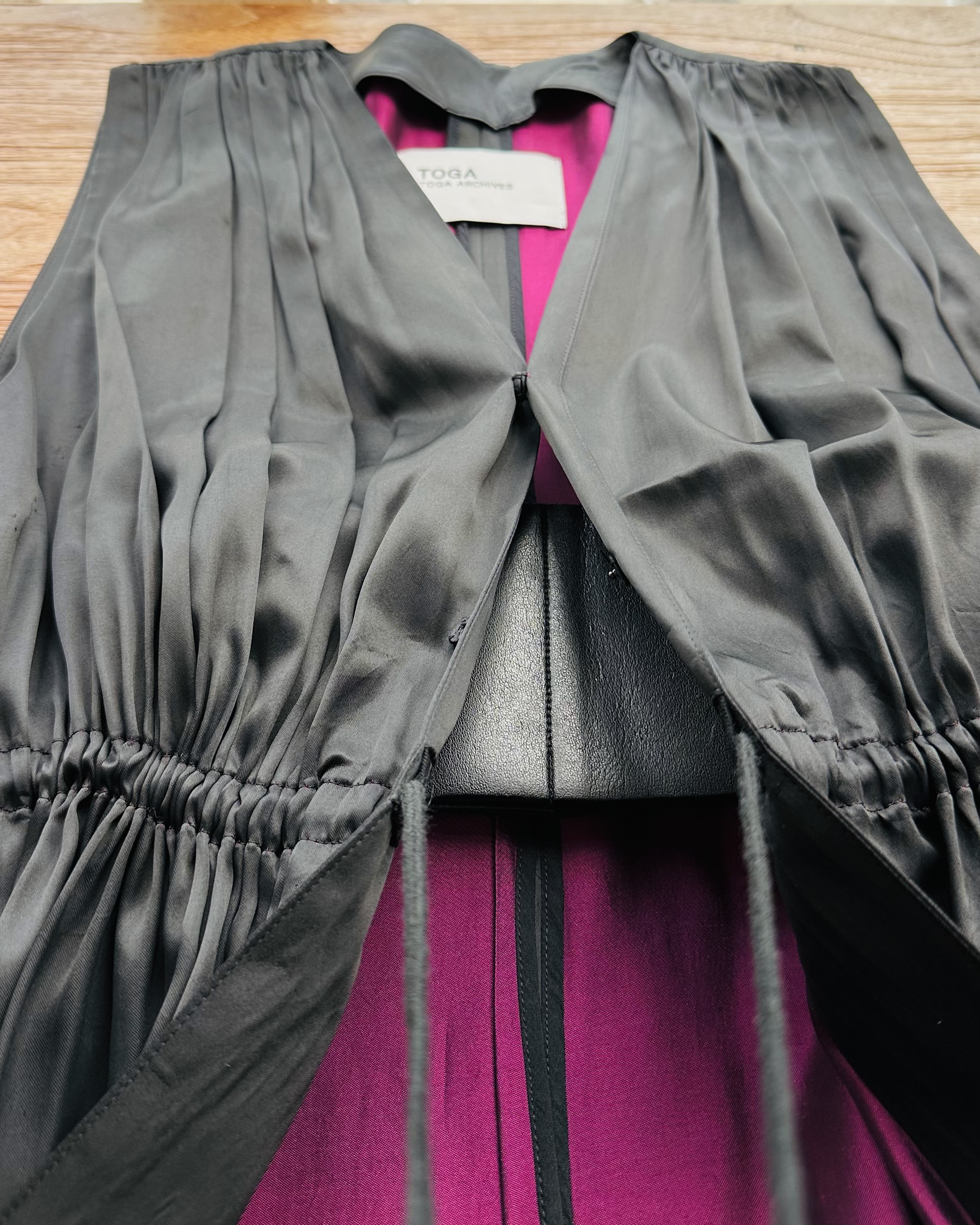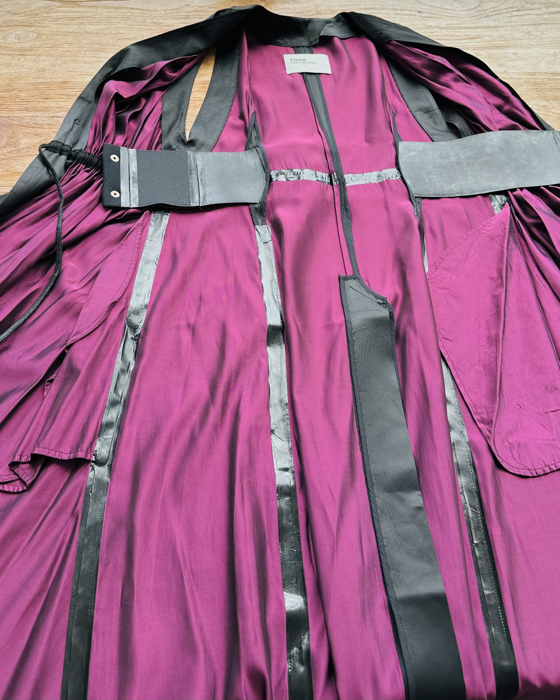 品牌:Toga Archives 尺碼:1 / S 尺寸:34cm (肩)|92cm (胸-buttoned)|92cm (腰-buttoned)|100cm+ (臀)|123cm (長) 註:83%新|皮帶摺痕| 背面上身及右膊布料耗損| 64% acetate + 36% cupra|synthetic leather|日本製 *二手產品難達全新狀態,耗損或歲月痕跡屬正常情況,較明顯/嚴重嘅問題會標明或影底,敬請見諒。 *進入付款程序後,請於10分鐘內完成付款,否則絲統會自動取消訂單。 逢星期四寄出|不設退換或退款|順豐運費到付|只寄香港不寄海外