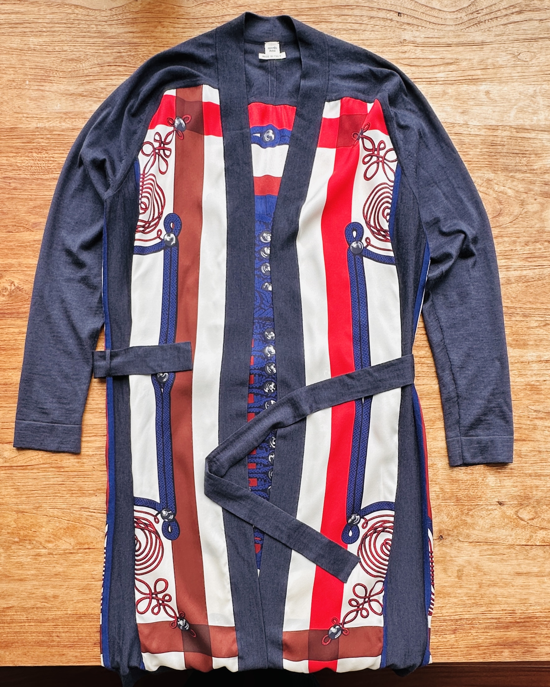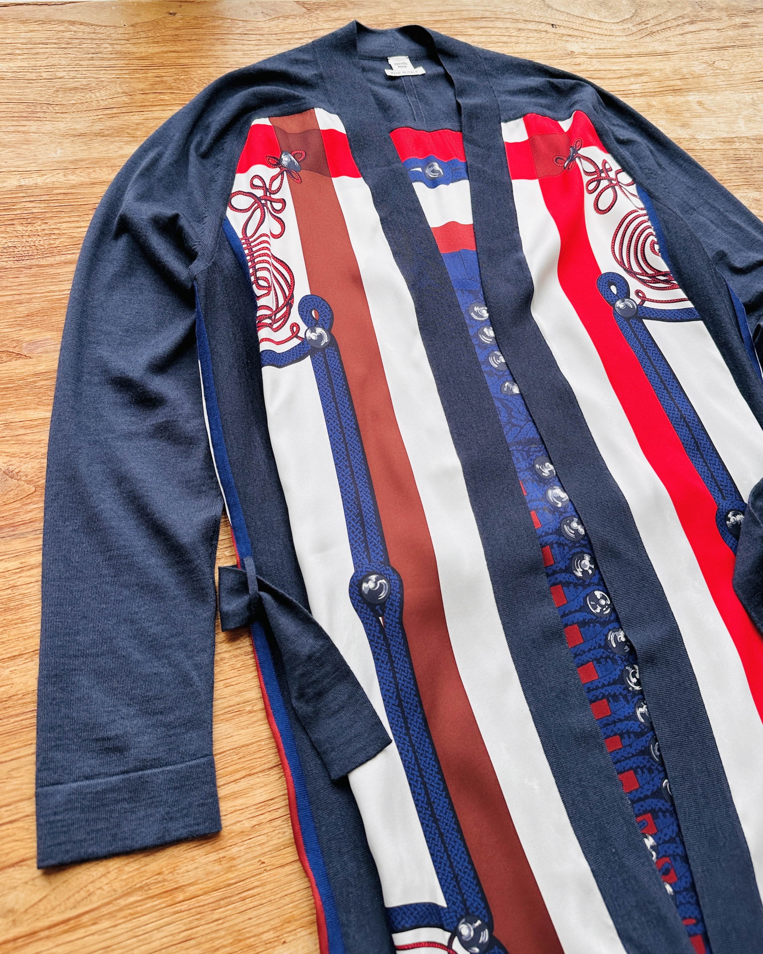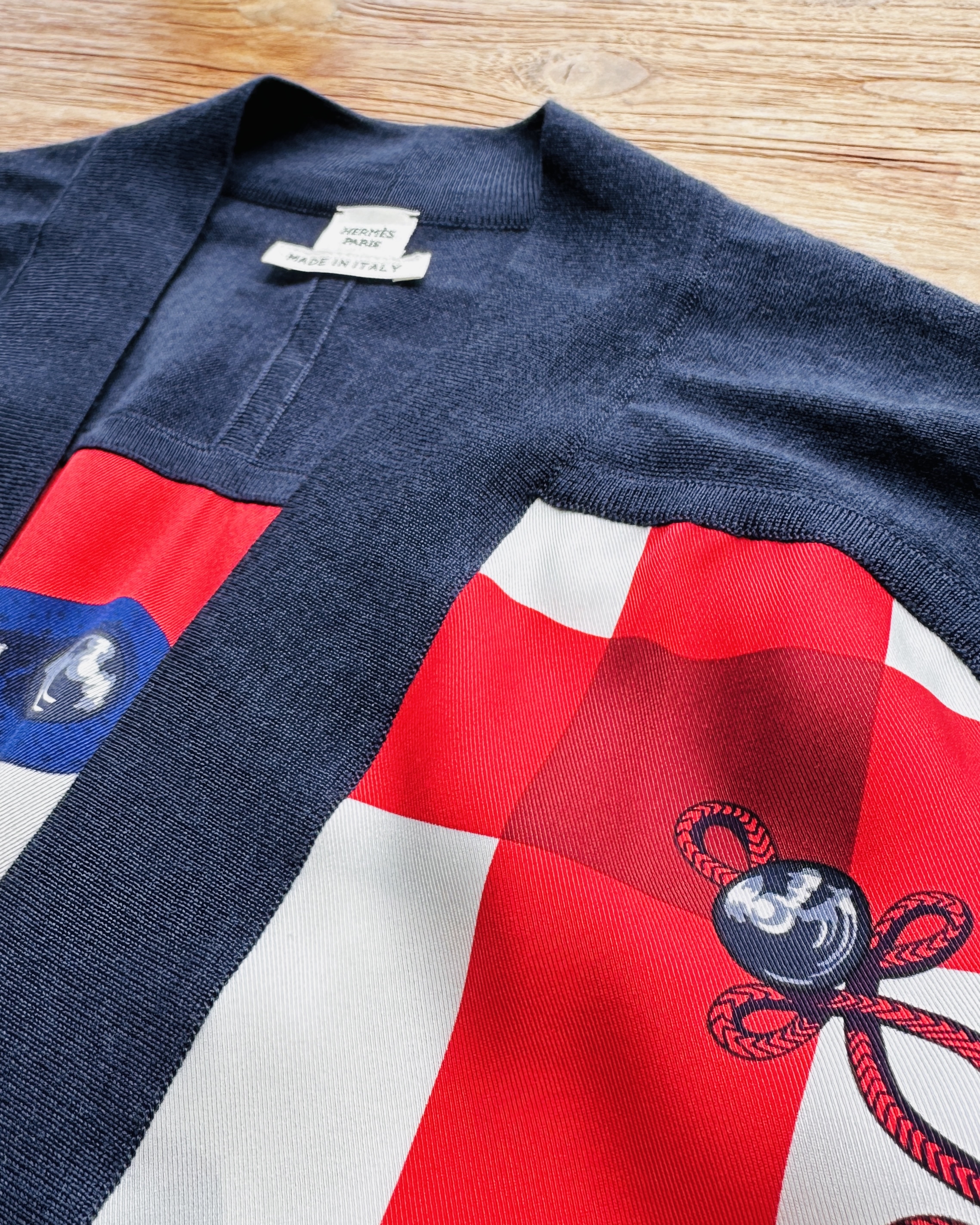 Hermes cashmere-silk twillaine long cardigan🔥!冇錯,就係傳說中郁啲都HK$30K+嘅twillaine,呢件HK$40K,鬼叫佢將品牌最馳名嘅絲巾同傲視同儕嘅cashmere搓埋一碟。FYI呢件2019 resort勁新淨🤩 價錢:HK$4,000 品牌:Hermes 尺碼:FR 34 / XS 尺寸:~43cm (drop shoulder)|100cm (胸)|100cm (腰-腰帶可綁緊)|100cm+ (臀)|59cm (袖)|97cm (長) 註:88%新|100% silk| 50% cashmere + 50% silk|意大利製 *二手產品難達全新狀態,耗損或歲月痕跡屬正常情況,較明顯/嚴重嘅問題會標明或影底,敬請見諒。 *進入付款程序後,請於10分鐘內完成付款,否則絲統會自動取消訂單。 逢星期四寄出|不設退換或退款|順豐運費到付|只寄香港不寄海外