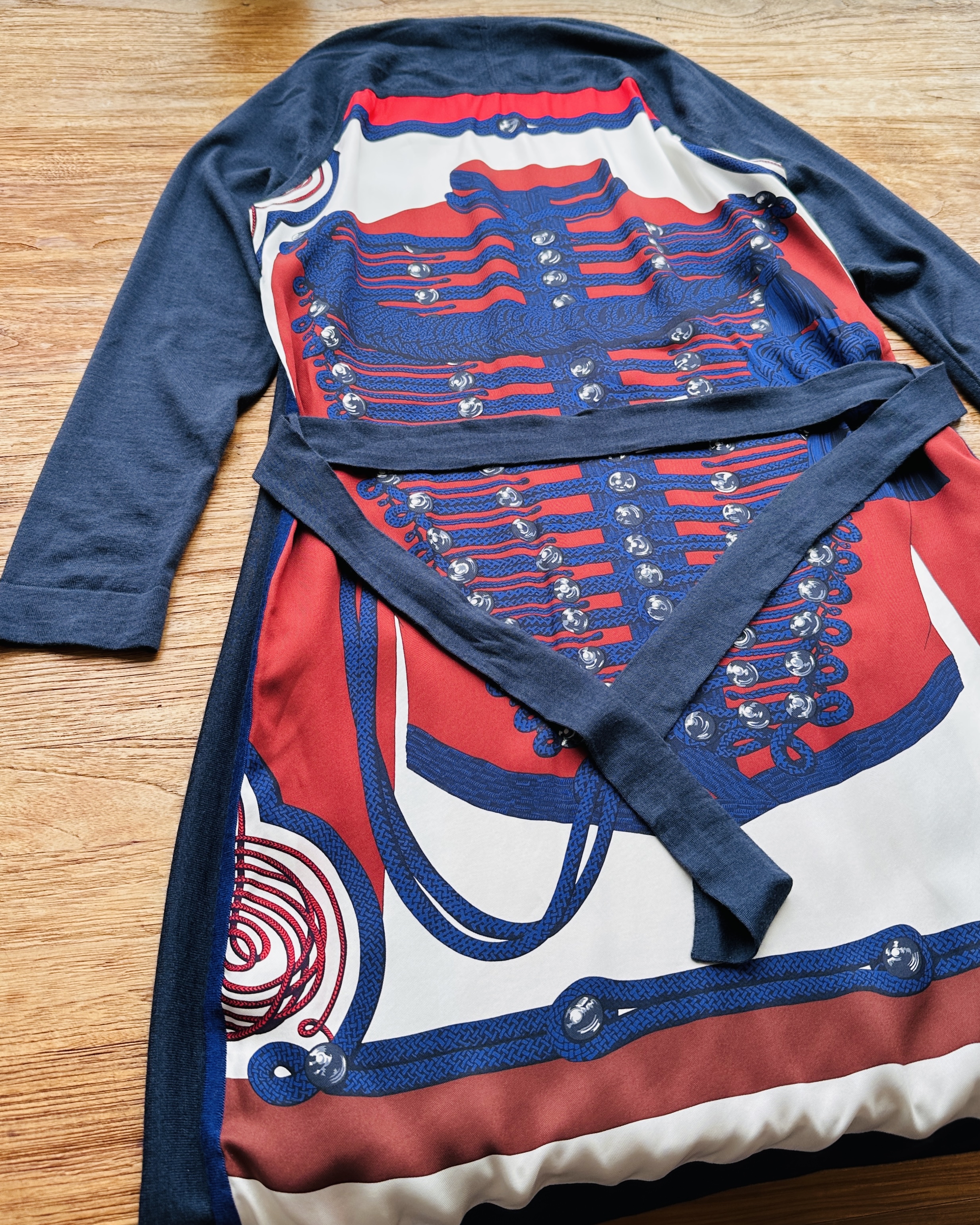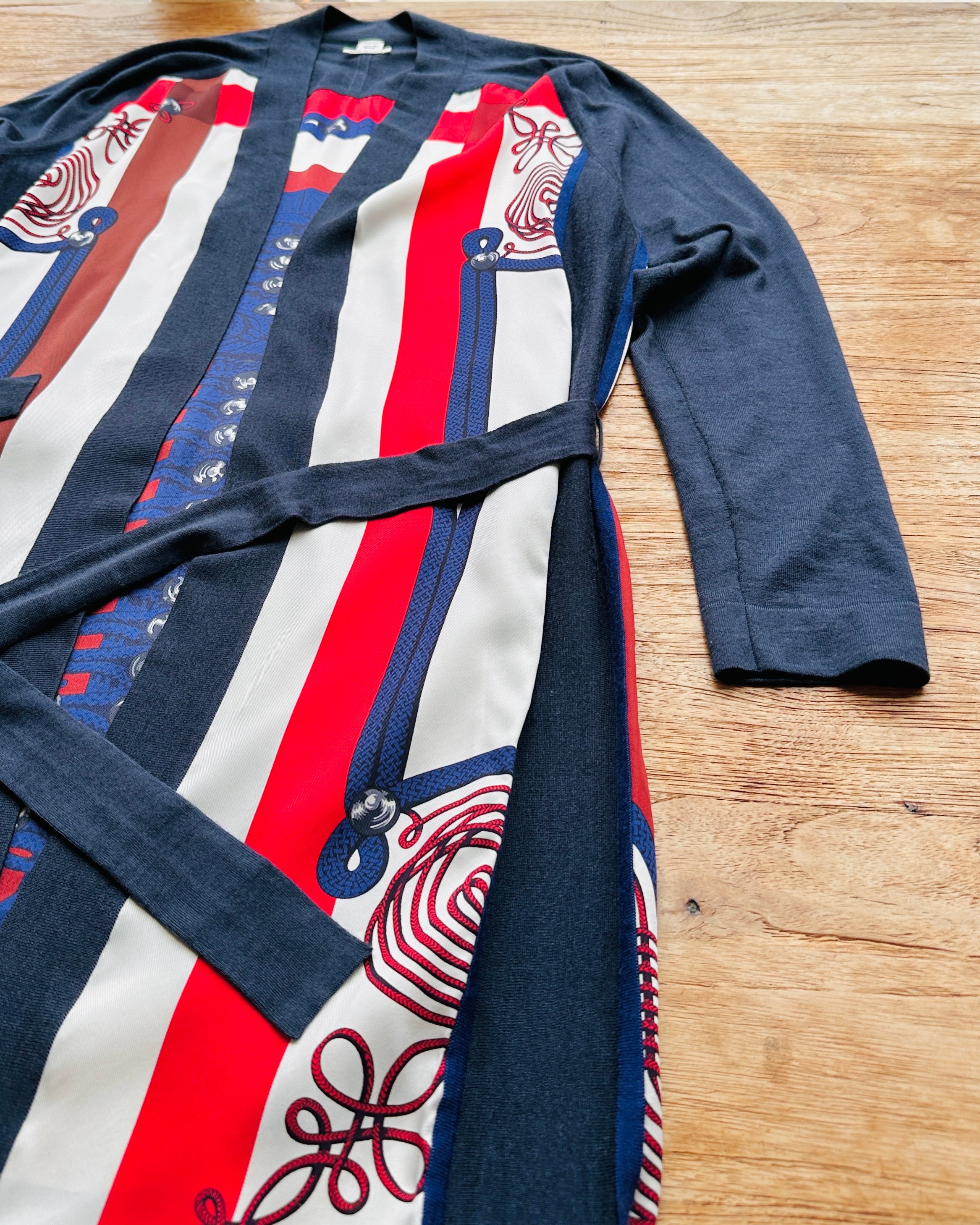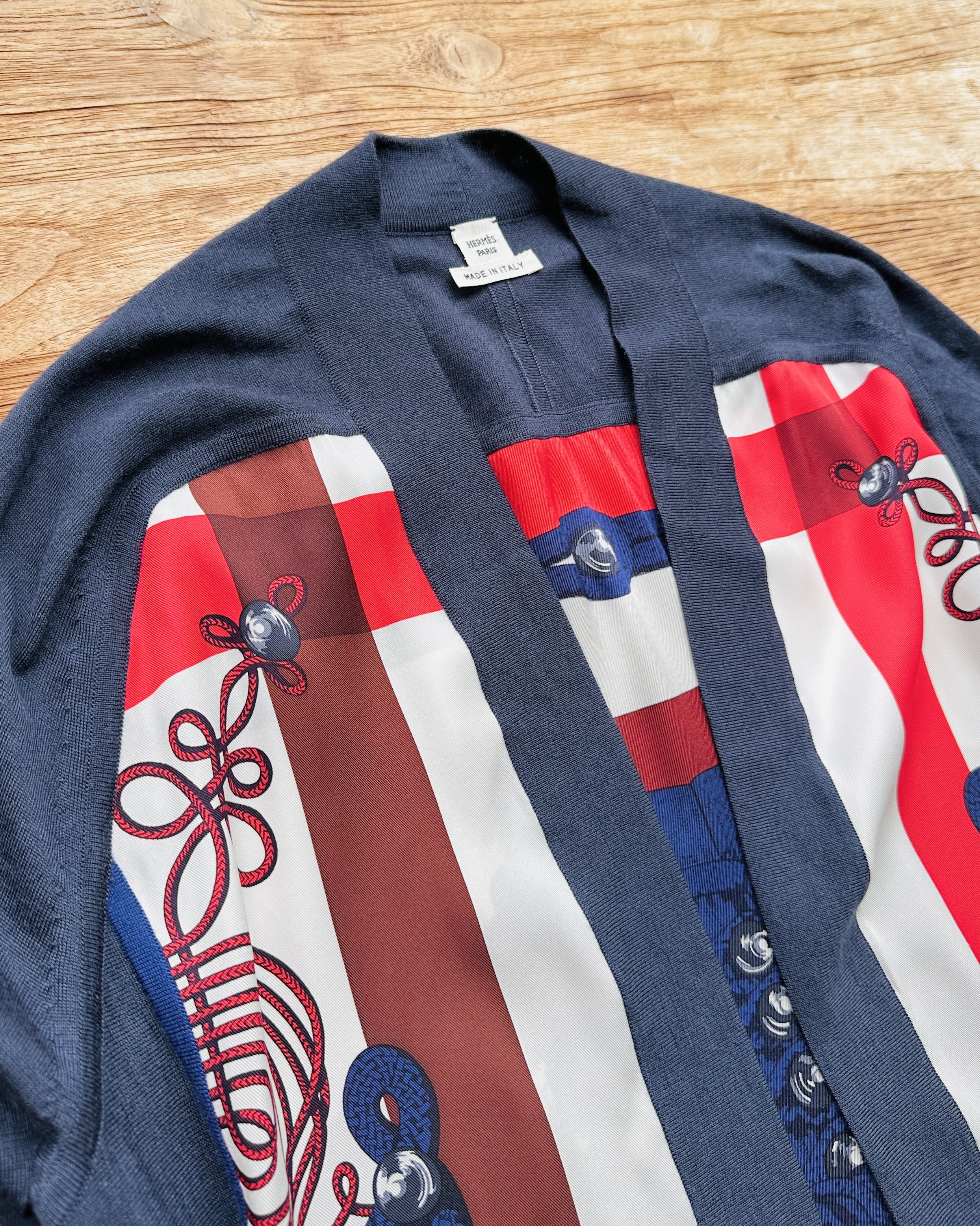 Hermes cashmere-silk twillaine long cardigan🔥!冇錯,就係傳說中郁啲都HK$30K+嘅twillaine,呢件HK$40K,鬼叫佢將品牌最馳名嘅絲巾同傲視同儕嘅cashmere搓埋一碟。FYI呢件2019 resort勁新淨🤩 價錢:HK$4,000 品牌:Hermes 尺碼:FR 34 / XS 尺寸:~43cm (drop shoulder)|100cm (胸)|100cm (腰-腰帶可綁緊)|100cm+ (臀)|59cm (袖)|97cm (長) 註:88%新|100% silk| 50% cashmere + 50% silk|意大利製 *二手產品難達全新狀態,耗損或歲月痕跡屬正常情況,較明顯/嚴重嘅問題會標明或影底,敬請見諒。 *進入付款程序後,請於10分鐘內完成付款,否則絲統會自動取消訂單。 逢星期四寄出|不設退換或退款|順豐運費到付|只寄香港不寄海外
