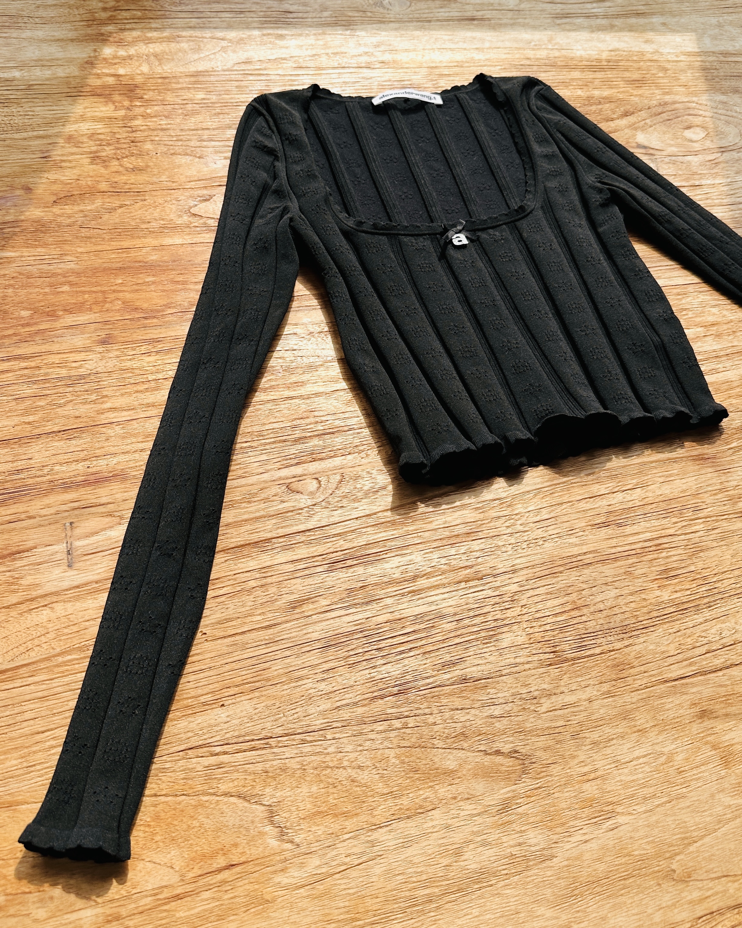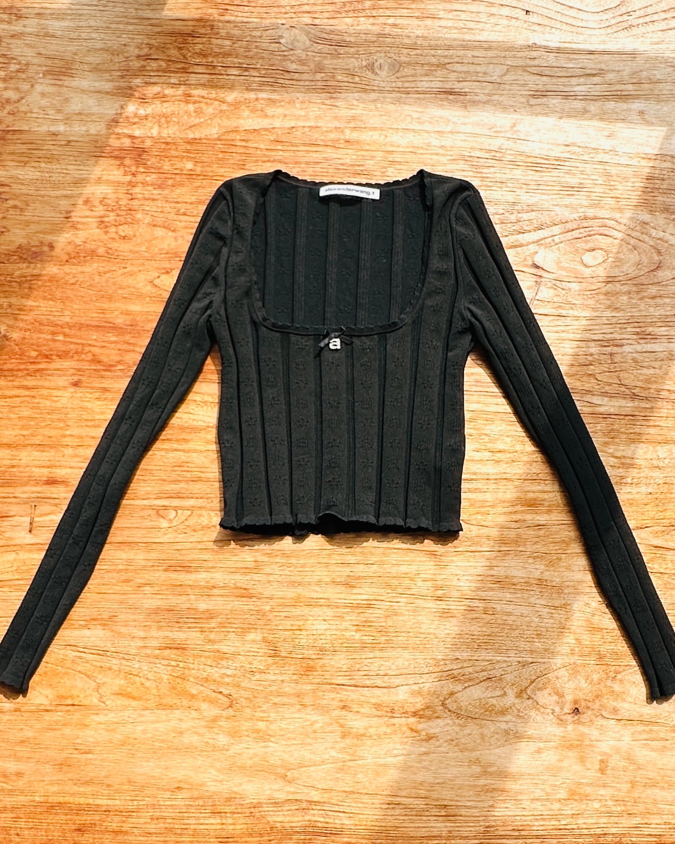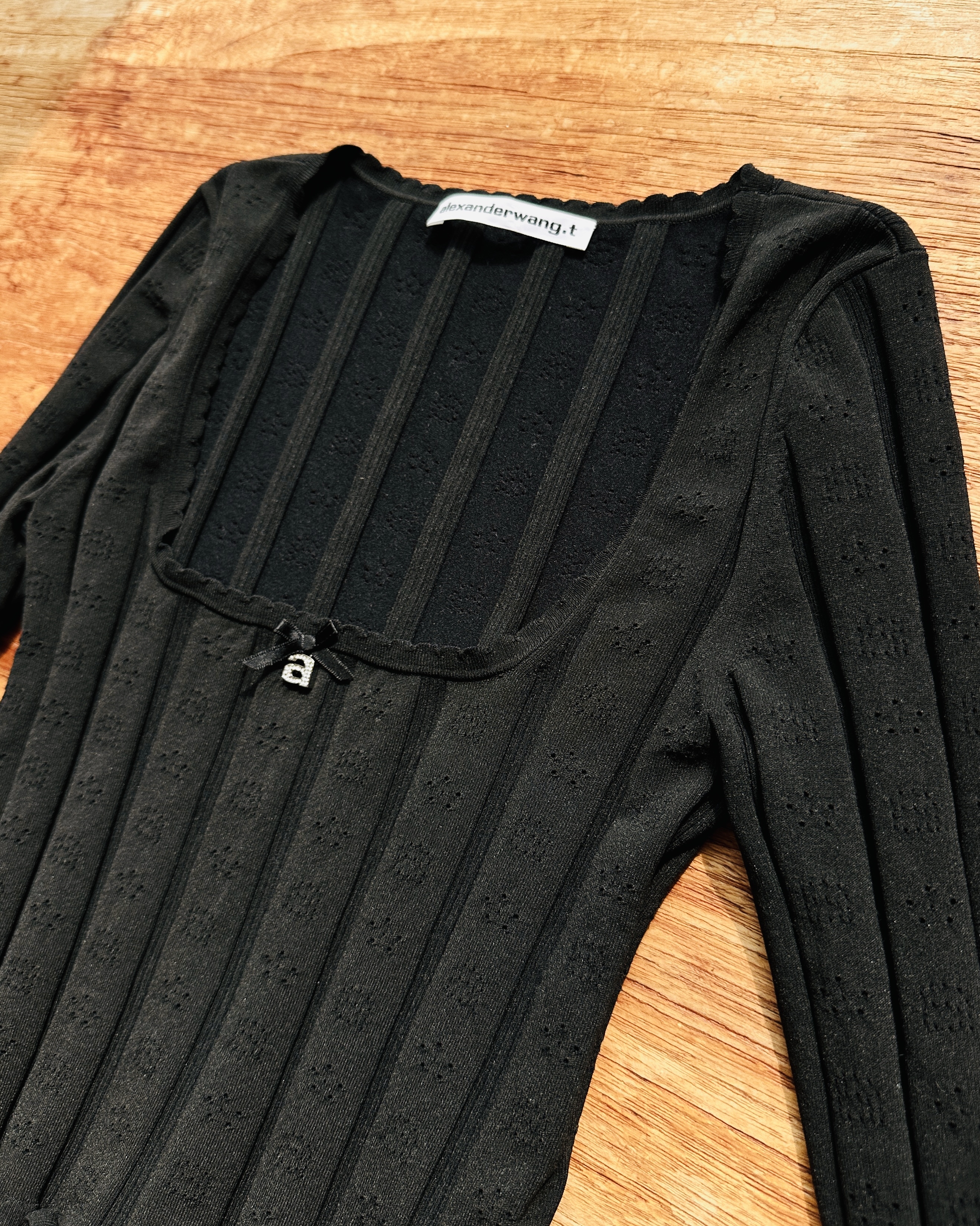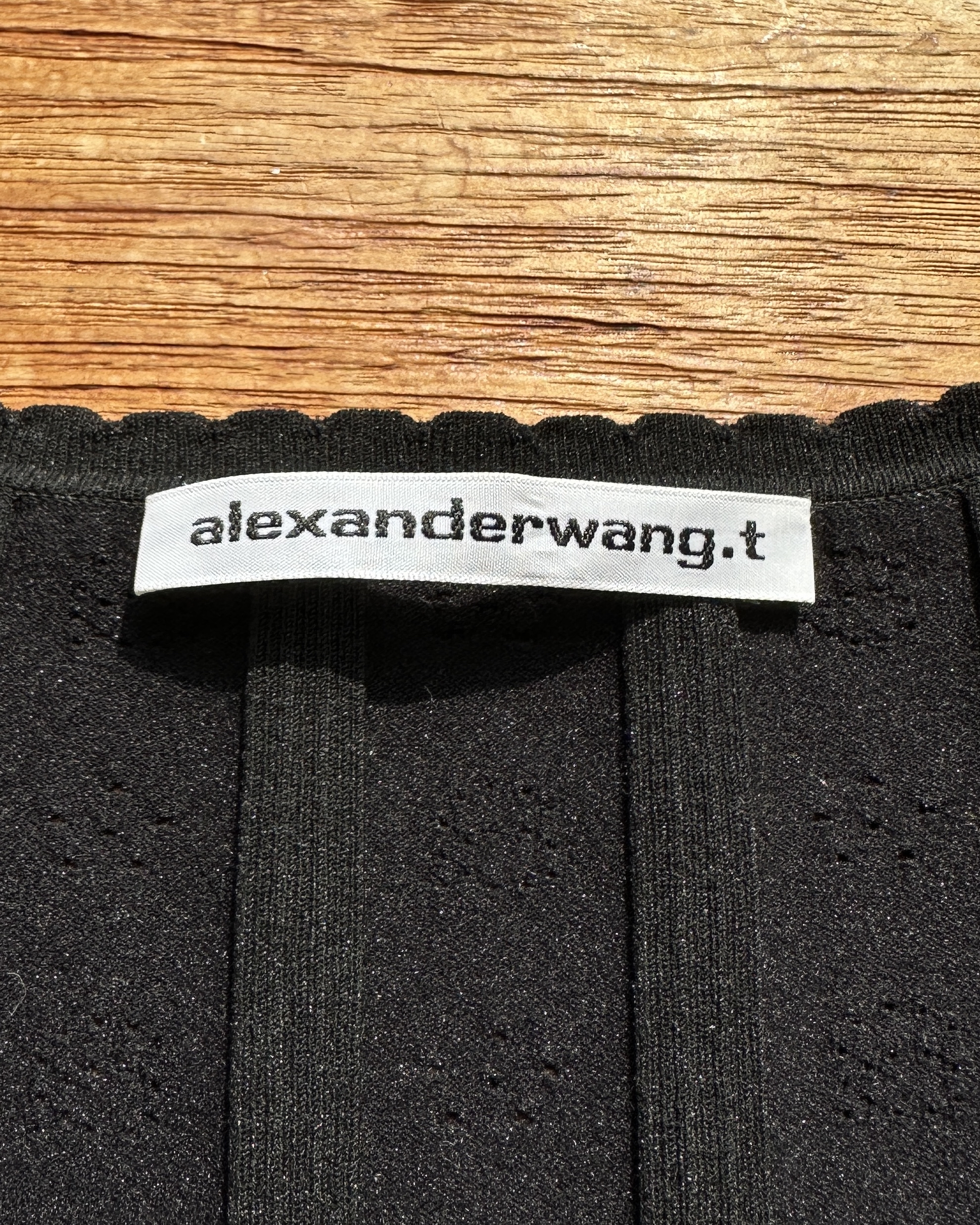 10個妹豬7個鍾意pointelle🐣,可能細個曾經有類似嘅底衫,不過通常白色嘅,於是大個見到呢種窿窿衫就有份莫名嘅情意結,着住有安全感囉👩🏻🍼 價錢:HK$700 品牌:Alexander Wang 尺碼:S / 160/80A 尺寸:36cm (肩)|80cm (胸)|64cm (腰)|57cm (袖)|39cm (長) 註:85%新|92% polyamide + 8% elastane *二手產品難達全新狀態,耗損或歲月痕跡屬正常情況,較明顯/嚴重嘅問題會標明或影底,敬請見諒。 *進入付款程序後,請於10分鐘內完成付款,否則絲統會自動取消訂單。 逢星期四寄出|不設退換或退款|順豐運費到付|只寄香港不寄海外