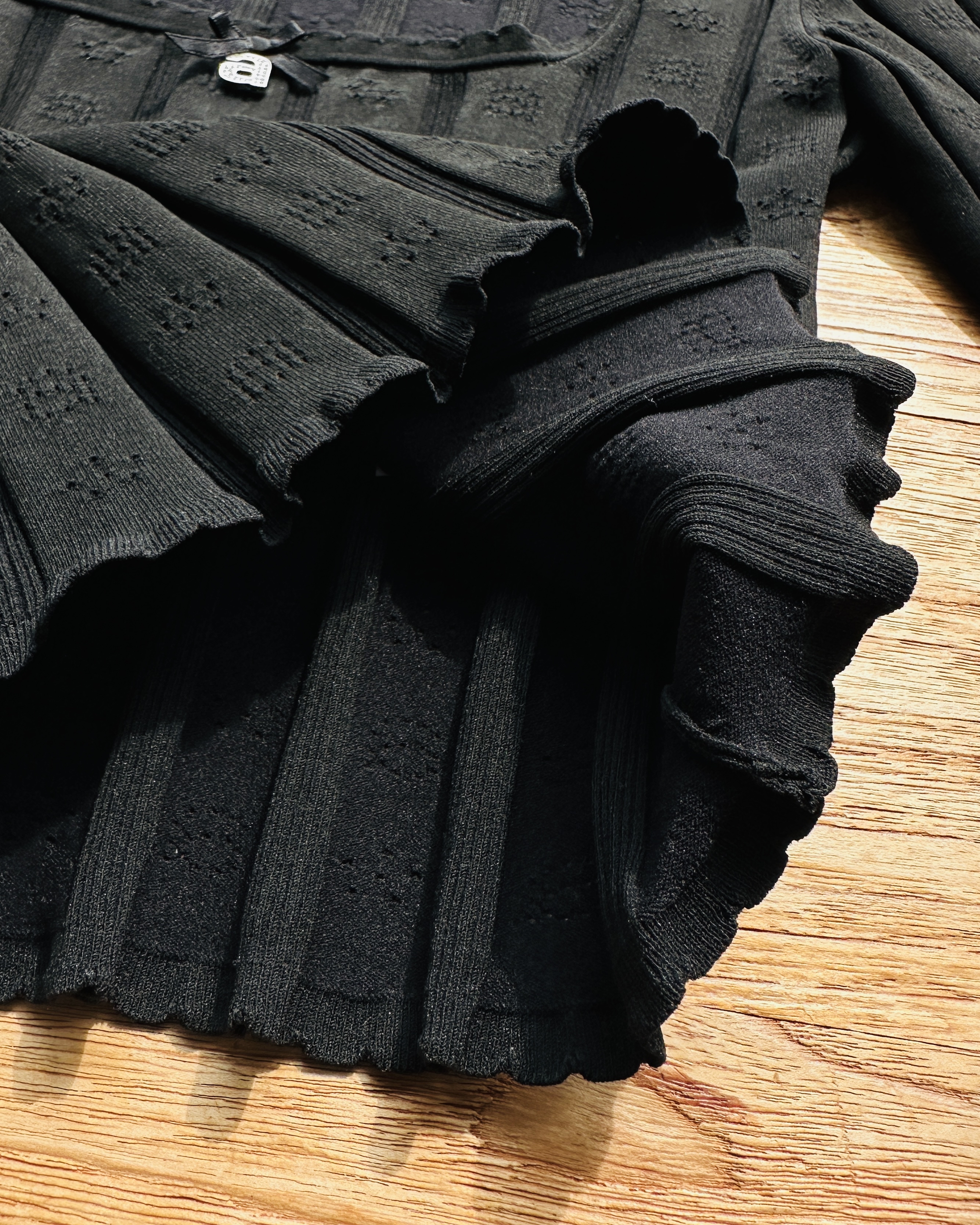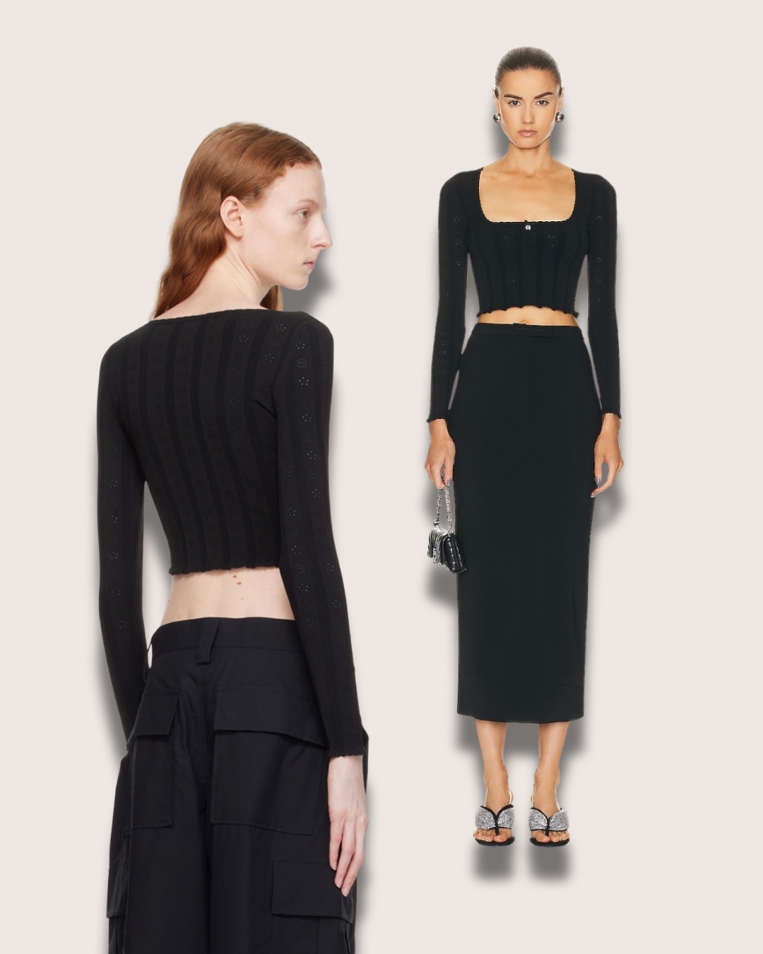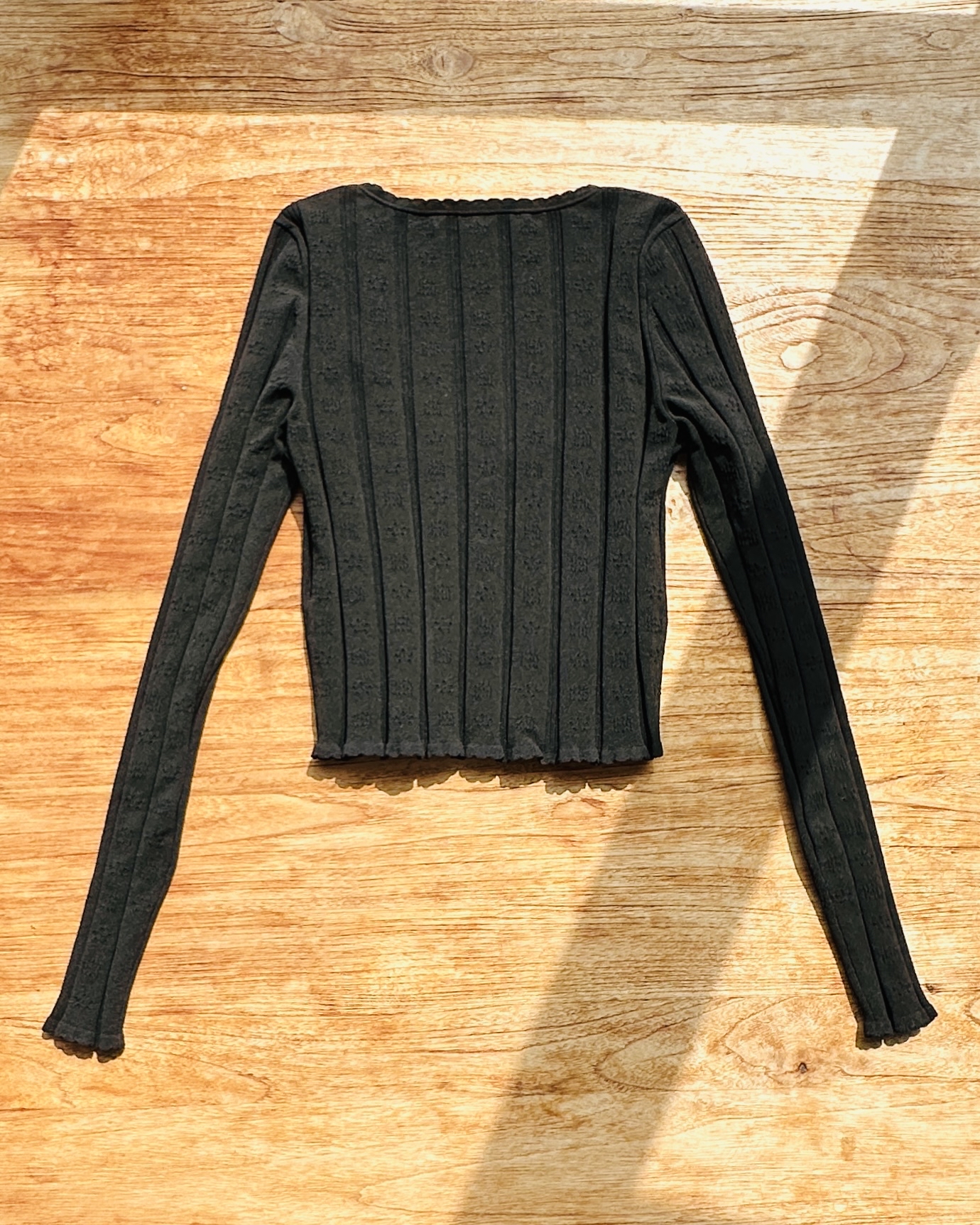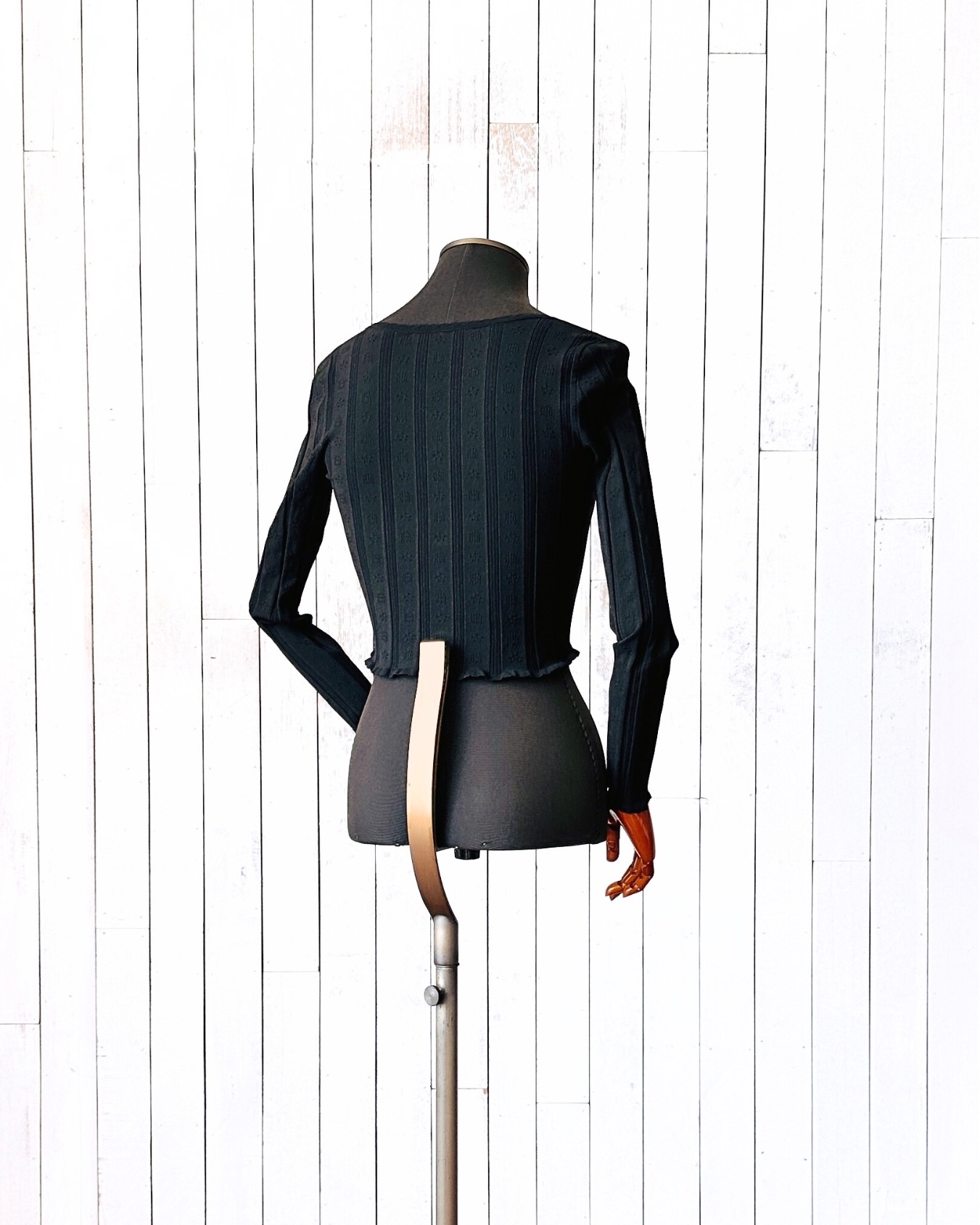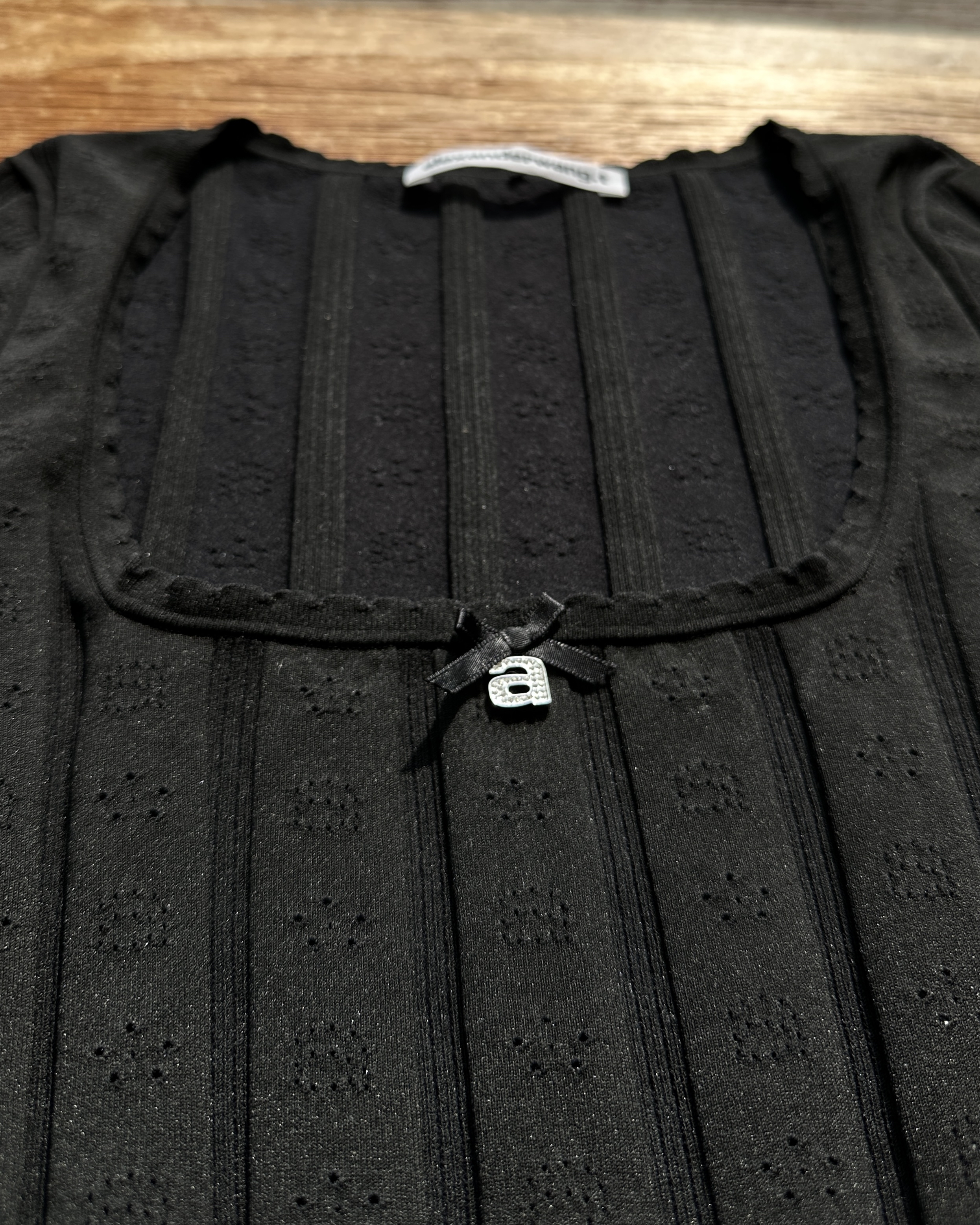 10個妹豬7個鍾意pointelle🐣,可能細個曾經有類似嘅底衫,不過通常白色嘅,於是大個見到呢種窿窿衫就有份莫名嘅情意結,着住有安全感囉👩🏻🍼 價錢:HK$700 品牌:Alexander Wang 尺碼:S / 160/80A 尺寸:36cm (肩)|80cm (胸)|64cm (腰)|57cm (袖)|39cm (長) 註:85%新|92% polyamide + 8% elastane *二手產品難達全新狀態,耗損或歲月痕跡屬正常情況,較明顯/嚴重嘅問題會標明或影底,敬請見諒。 *進入付款程序後,請於10分鐘內完成付款,否則絲統會自動取消訂單。 逢星期四寄出|不設退換或退款|順豐運費到付|只寄香港不寄海外