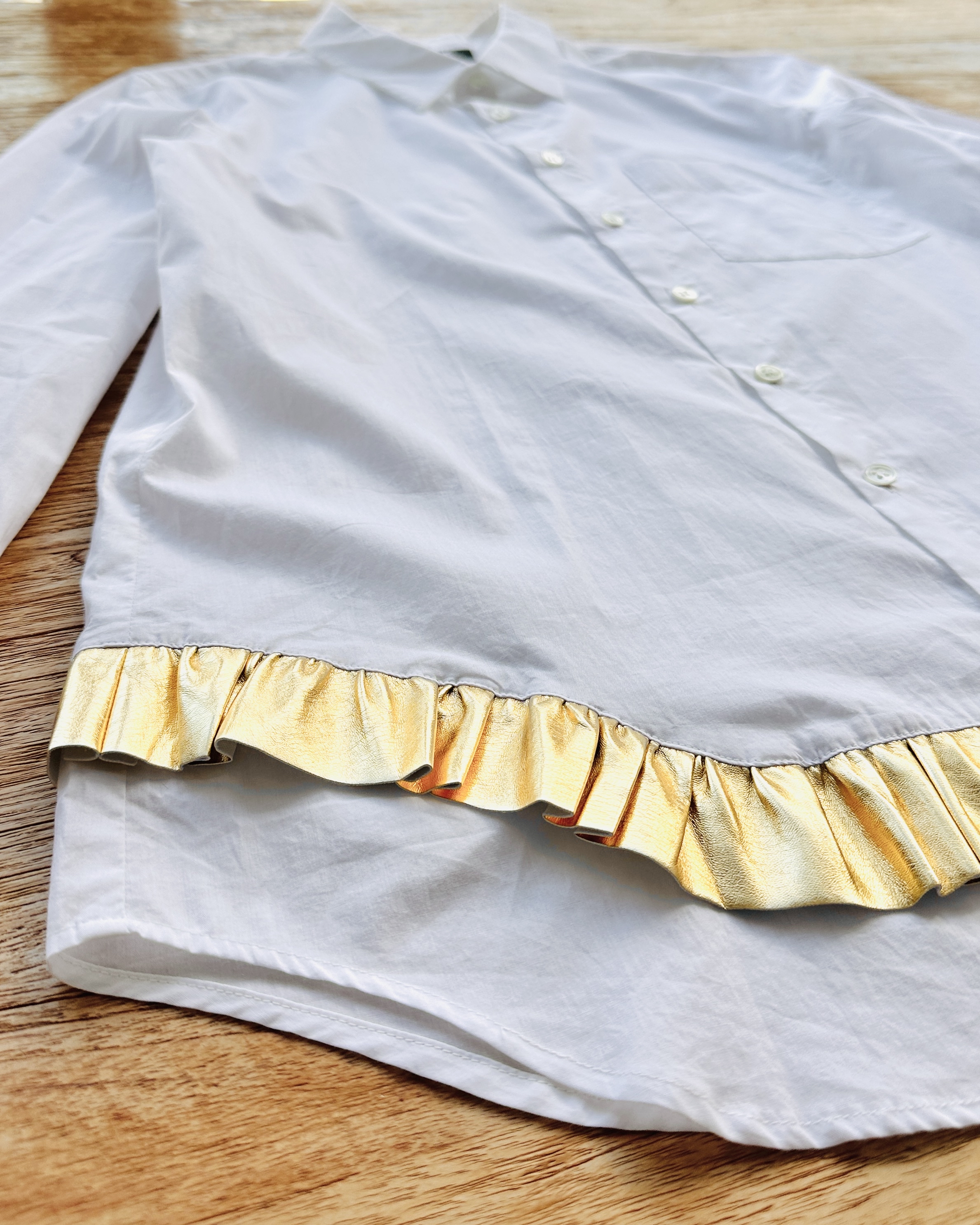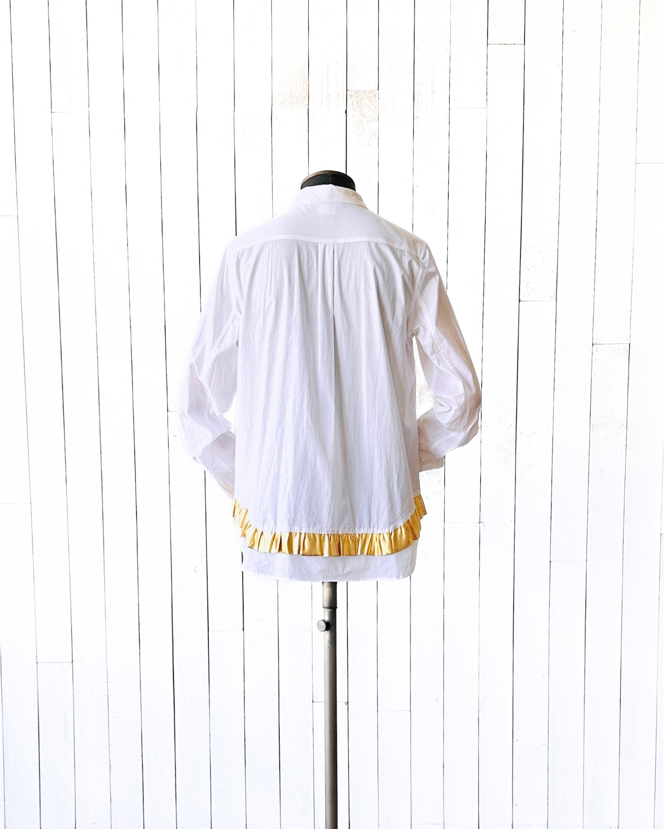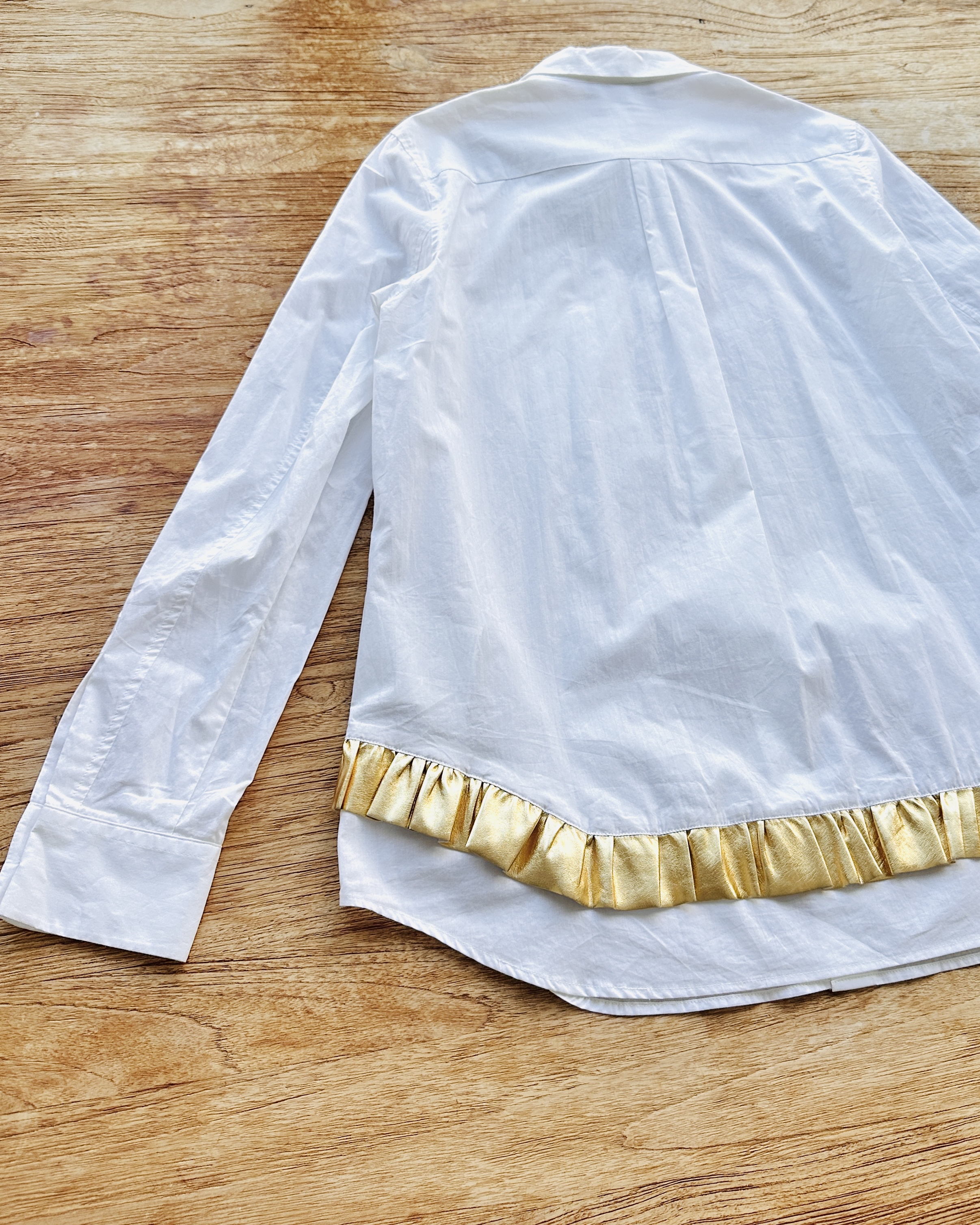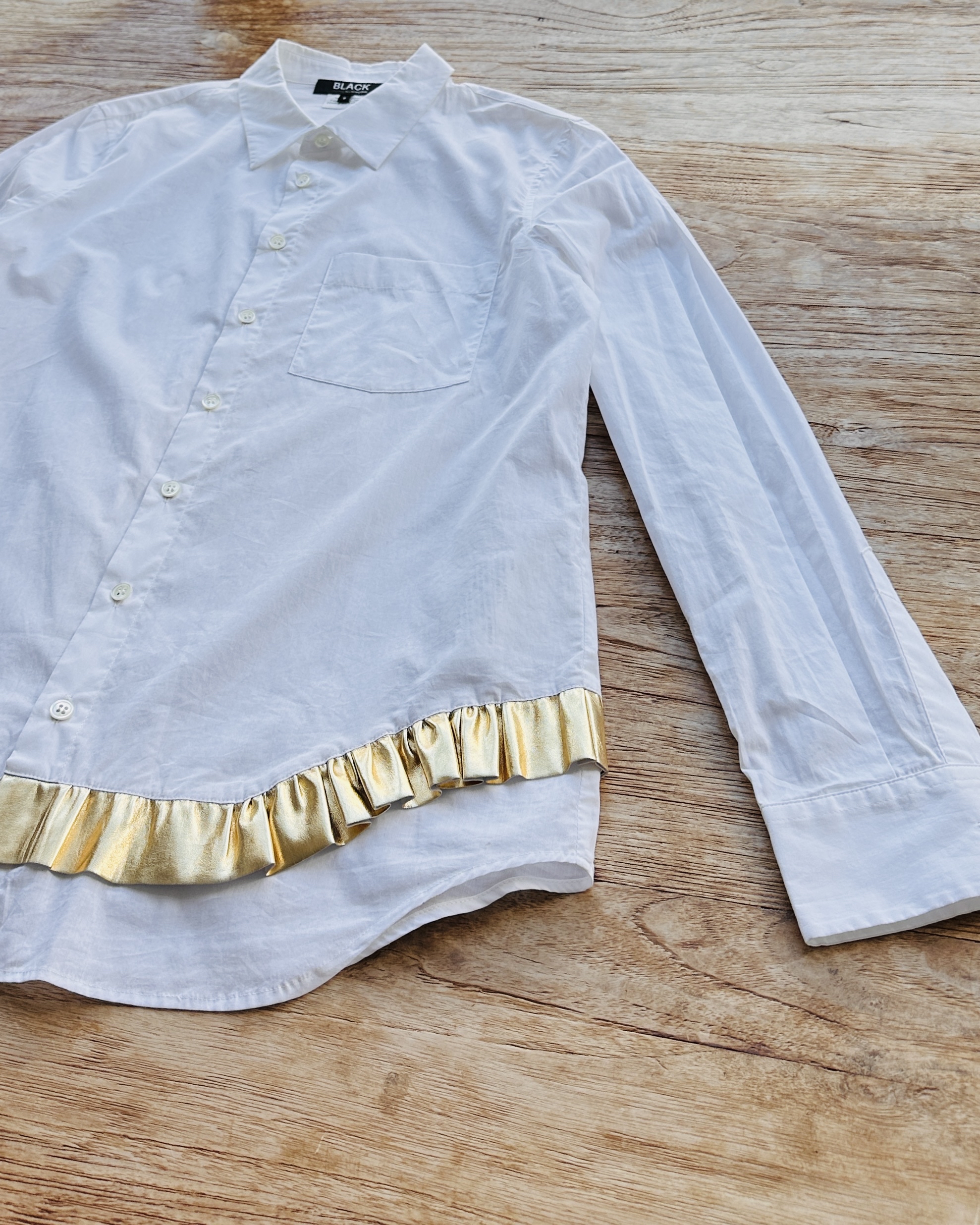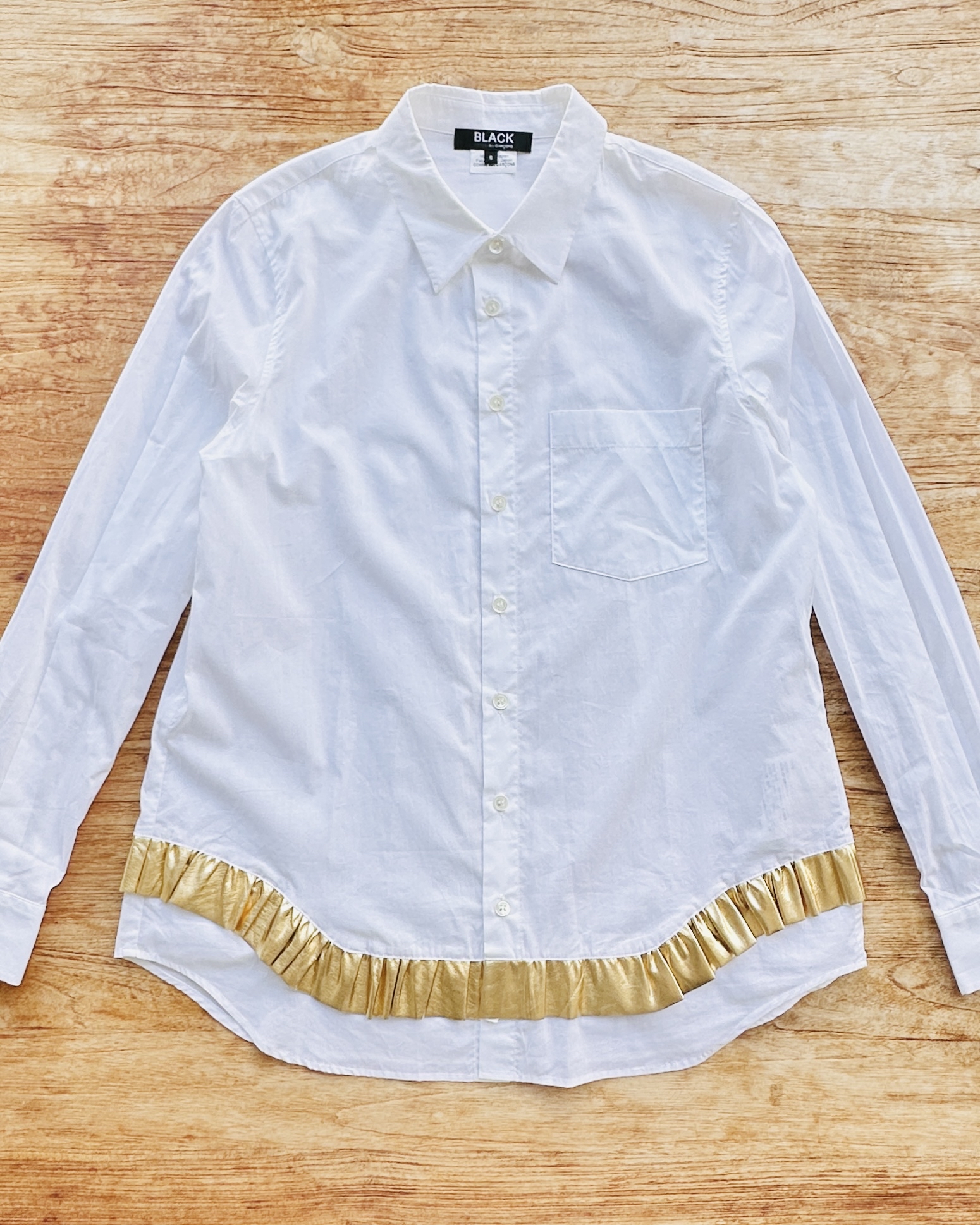 抄《Mill Milk》先:700萬種生活。我嘅生活係,不停遇到有趣嘅賣家🪂。係呀,呢位賣家好得意㗎,嚴重迷戀金色,連屋企啲牆都係金色嘅🌟。啲衫有啲誇張到唔敢收,呢件2019年算係當中最保守㗎啦。 價錢:HK$850 品牌:Black Comme des Garçons 尺碼:S 尺寸:39cm (肩)|100cm (胸)|100cm (腰)|61cm (袖)|69cm (長) 註:全新未使用|左袖內面小漬 (非汗漬)|100% cotton|日本製 *二手產品難達全新狀態,耗損或歲月痕跡屬正常情況,較明顯/嚴重嘅問題會標明或影底,敬請見諒。 *進入付款程序後,請於10分鐘內完成付款,否則絲統會自動取消訂單。 逢星期四寄出|不設退換或退款|順豐運費到付|只寄香港不寄海外