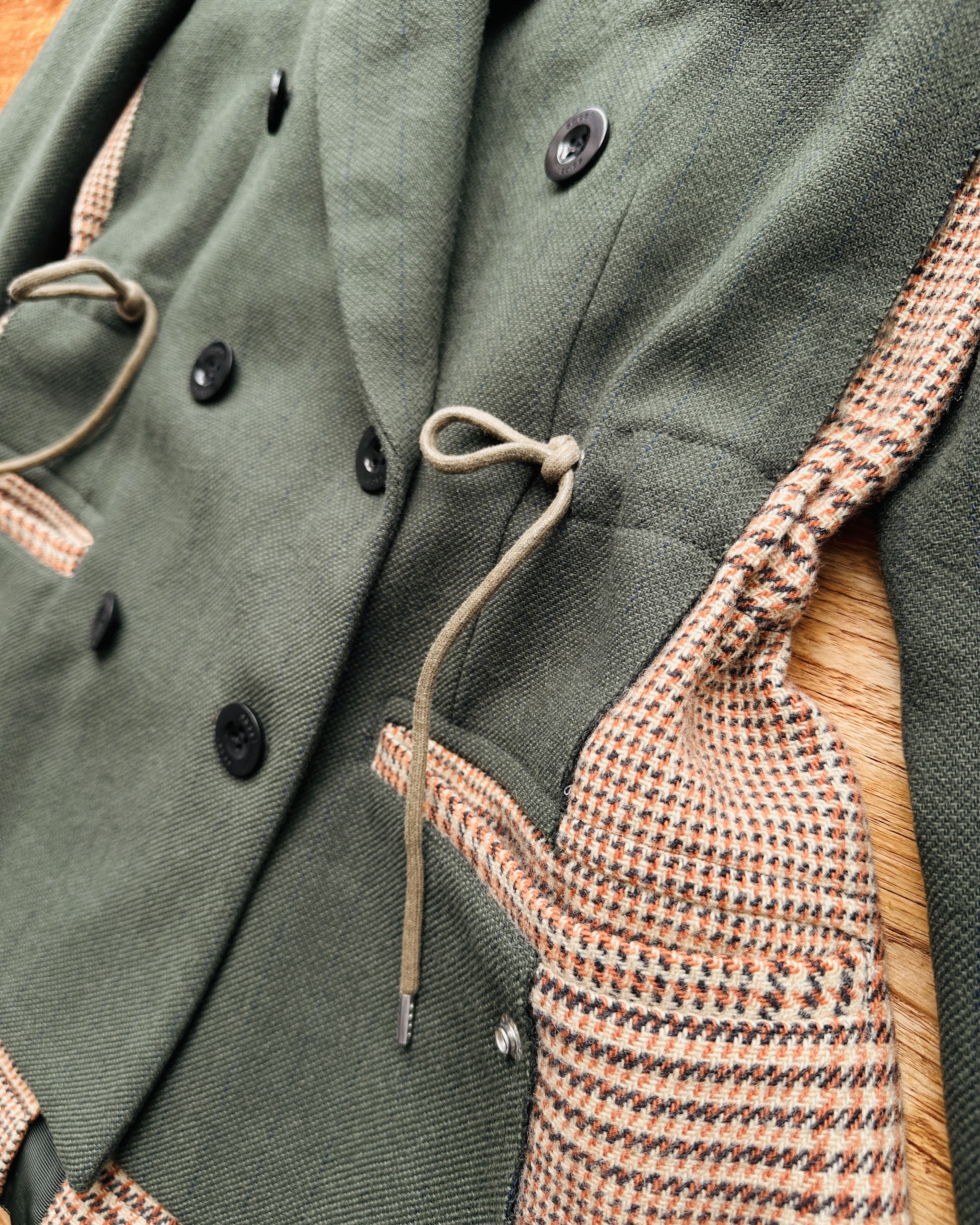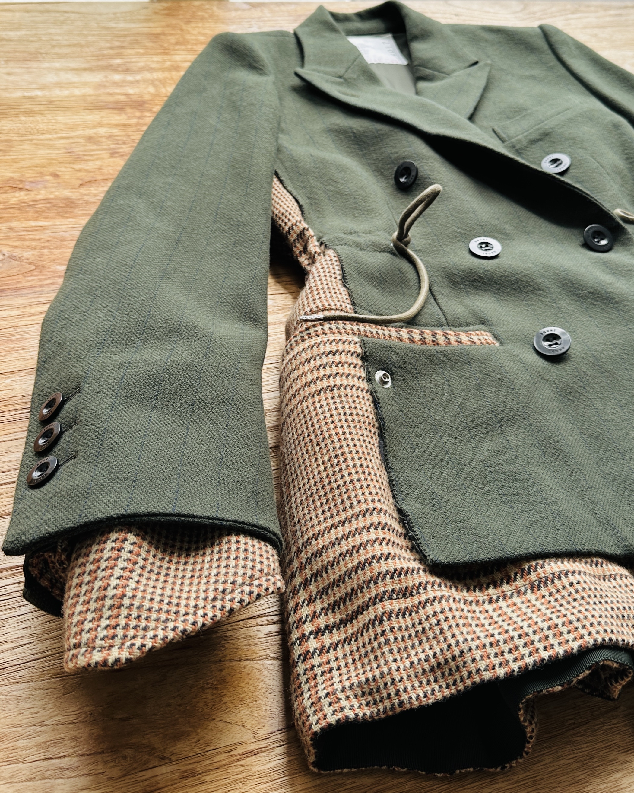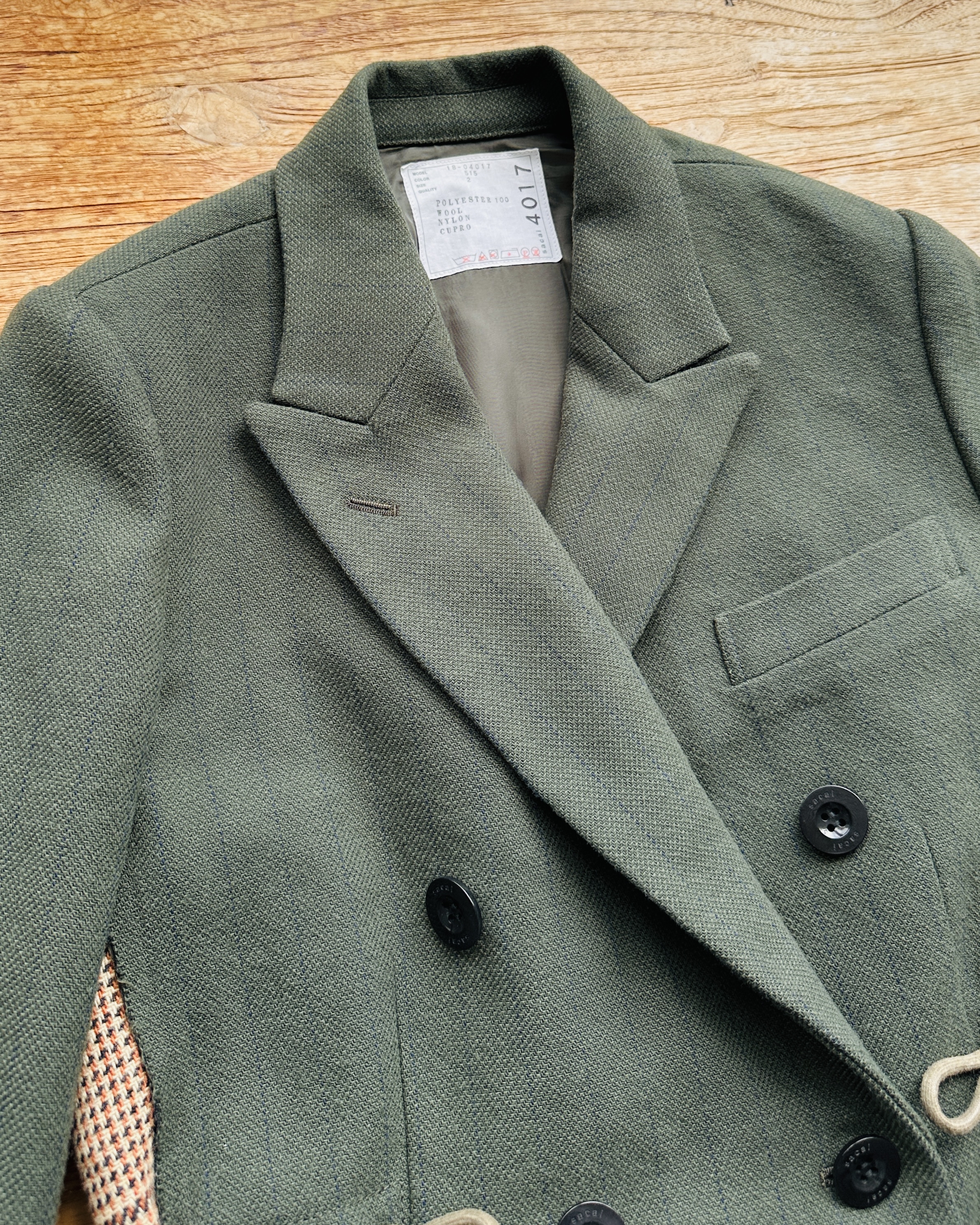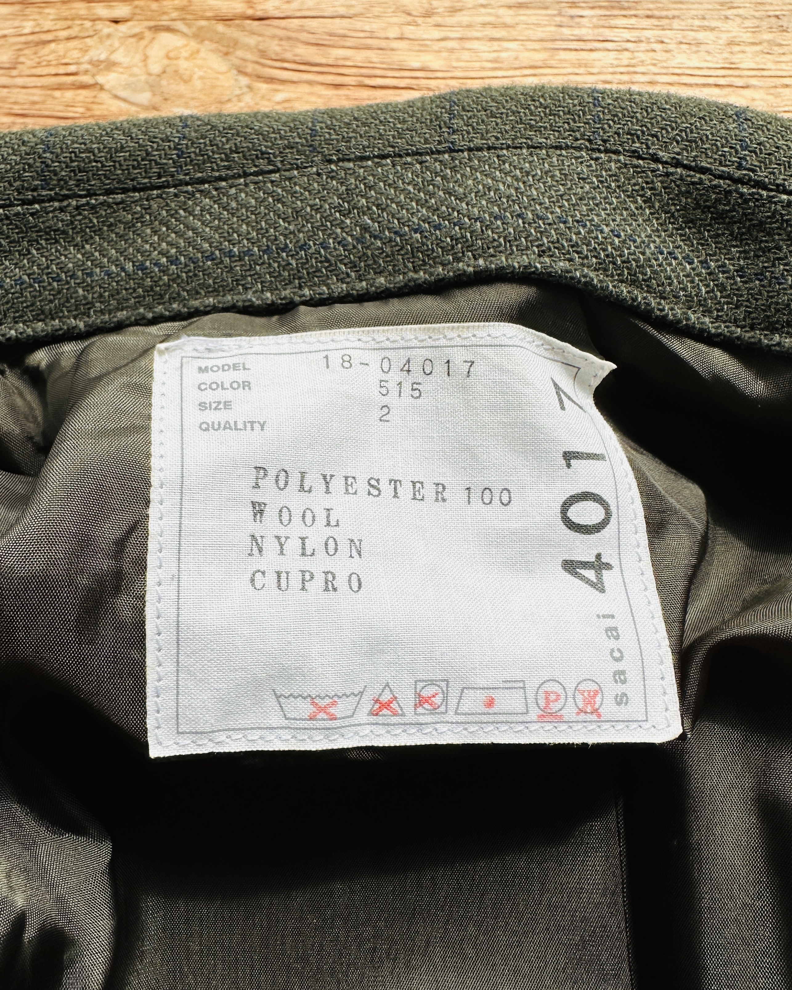 2018秋冬孖襟西裝褸;前pinstripe後Prince of Wales glen pleid,將傳統古龍水級佬味男裝變成妹豬型褸。Sacai係好波嘅⚽️ 價錢:HK$2,680 品牌:Sacai 尺碼:2 / S-M 尺寸:40cm (肩)|92cm (胸-buttoned)|100cm+ (腰-可索緊)|67cm (袖)|73cm (長) 註:83%新|100% polyester|100% wool|100% cupro (底)|日本製 *二手產品難達全新狀態,耗損或歲月痕跡屬正常情況,較明顯/嚴重嘅問題會標明或影底,敬請見諒。 *進入付款程序後,請於10分鐘內完成付款,否則絲統會自動取消訂單。 逢星期四寄出|不設退換或退款|順豐運費到付|只寄香港不寄海外