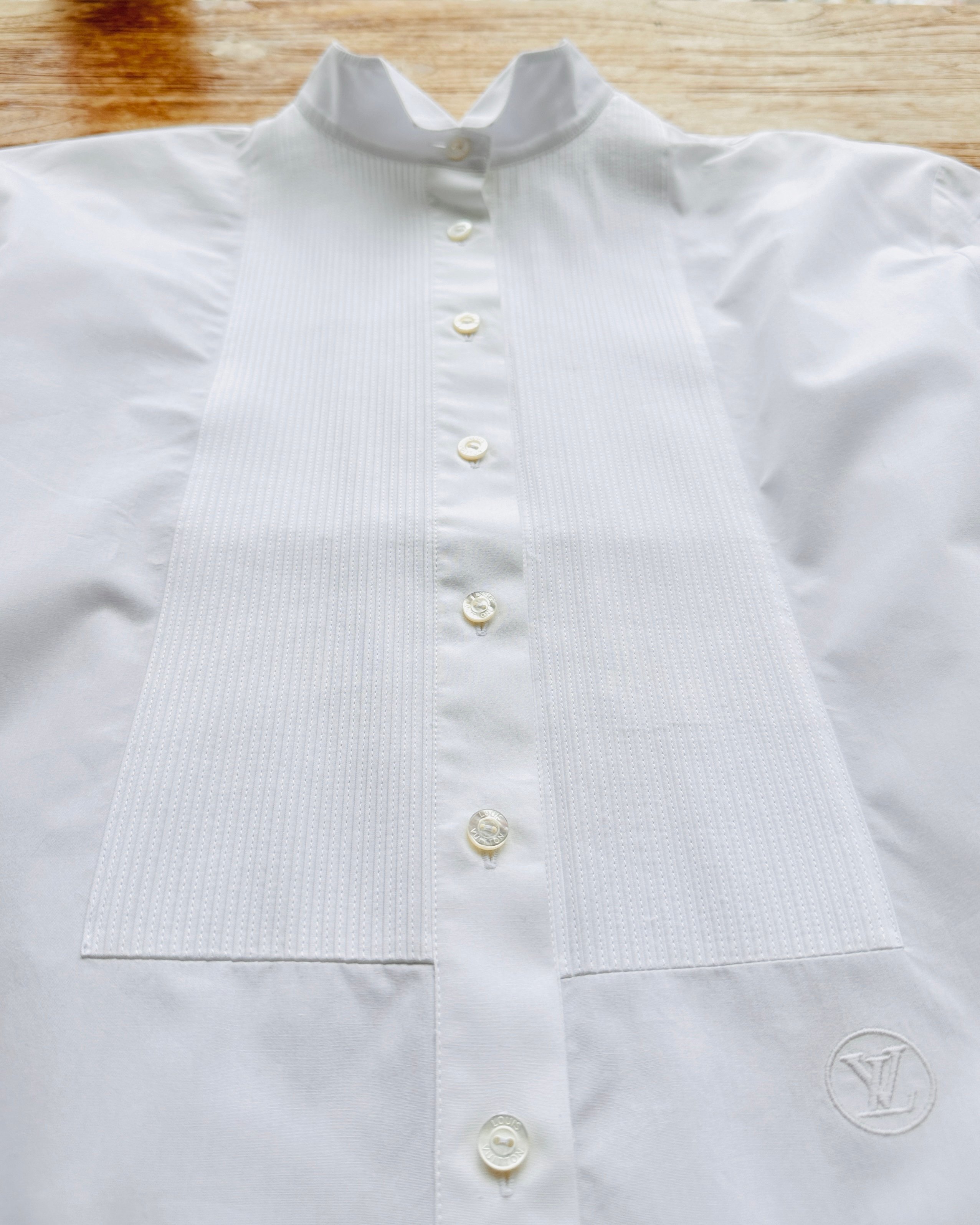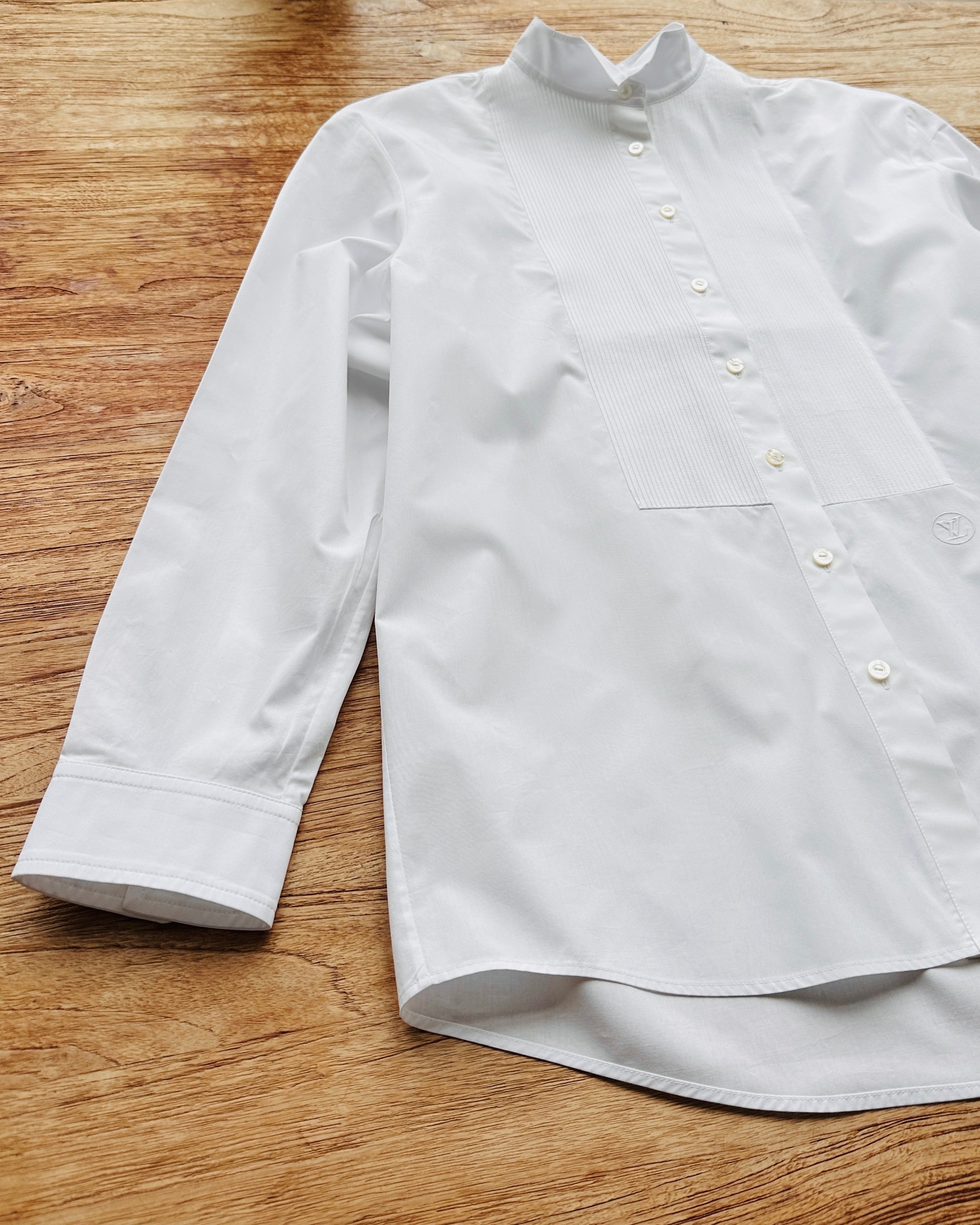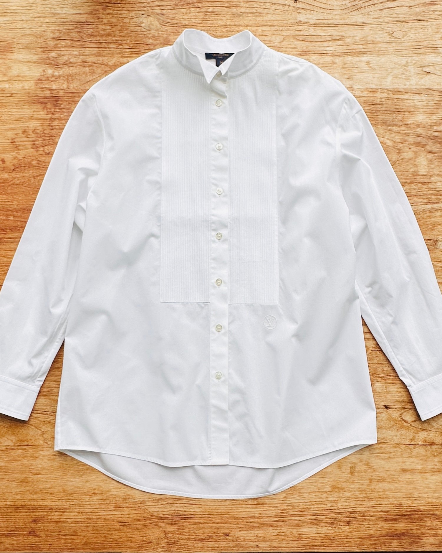 2021原價HK$10K+瀟灑tux shirt。瀟灑在個relaxed fit,即係可以玩Jace Marf Stephy Sammi Man姐式女子漢造型👉🏼硬朗貼服頭+紅唇👄+ tug in + 卷袖 +闊褲耍帥🤺 價錢:HK$2,000 品牌:Louis Vuitton 尺碼:FR 34 / 155/76A / XS 尺寸:47cm (肩)|104cm (胸)|104cm (腰)|55cm (袖)|70cm (前長)|75cm (後長) 註:全新未使用|左袖口唔起眼細粒淡啡漬|100% cotton|95% cotton + 5% polyester| 意大利製 *二手產品難達全新狀態,耗損或歲月痕跡屬正常情況,較明顯/嚴重嘅問題會標明或影底,敬請見諒。 *進入付款程序後,請於10分鐘內完成付款,否則絲統會自動取消訂單。 逢星期四寄出|不設退換或退款|順豐運費到付|只寄香港不寄海外