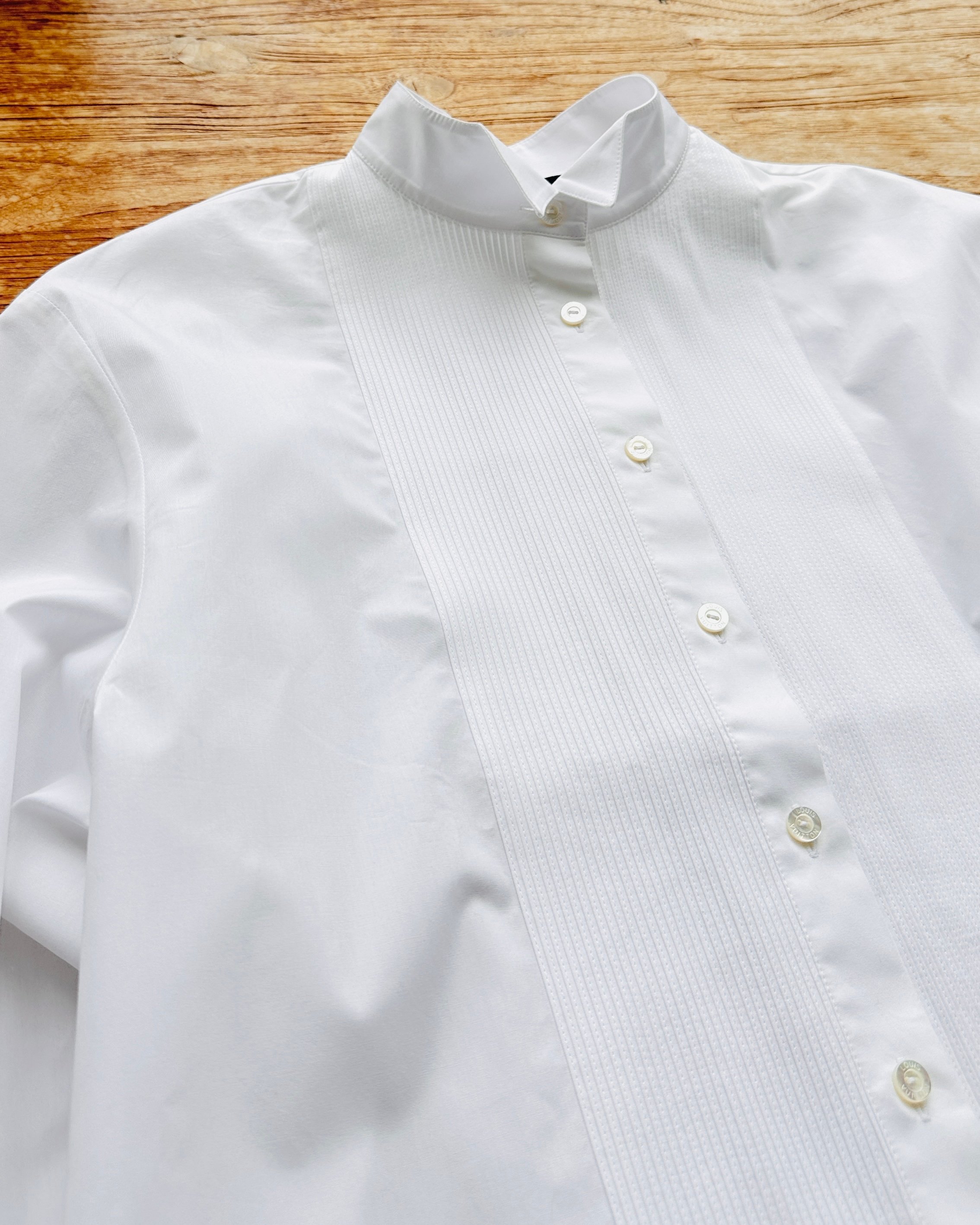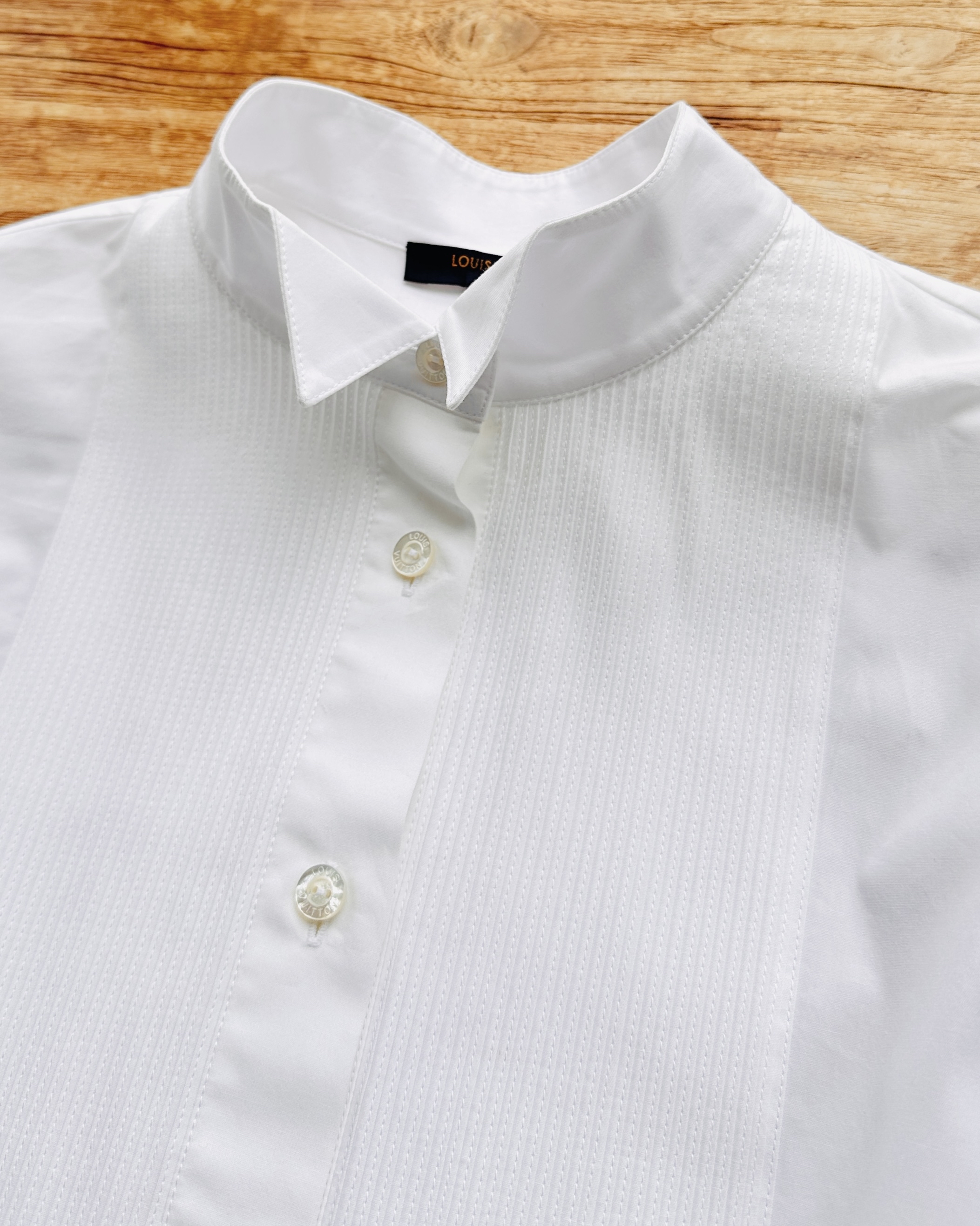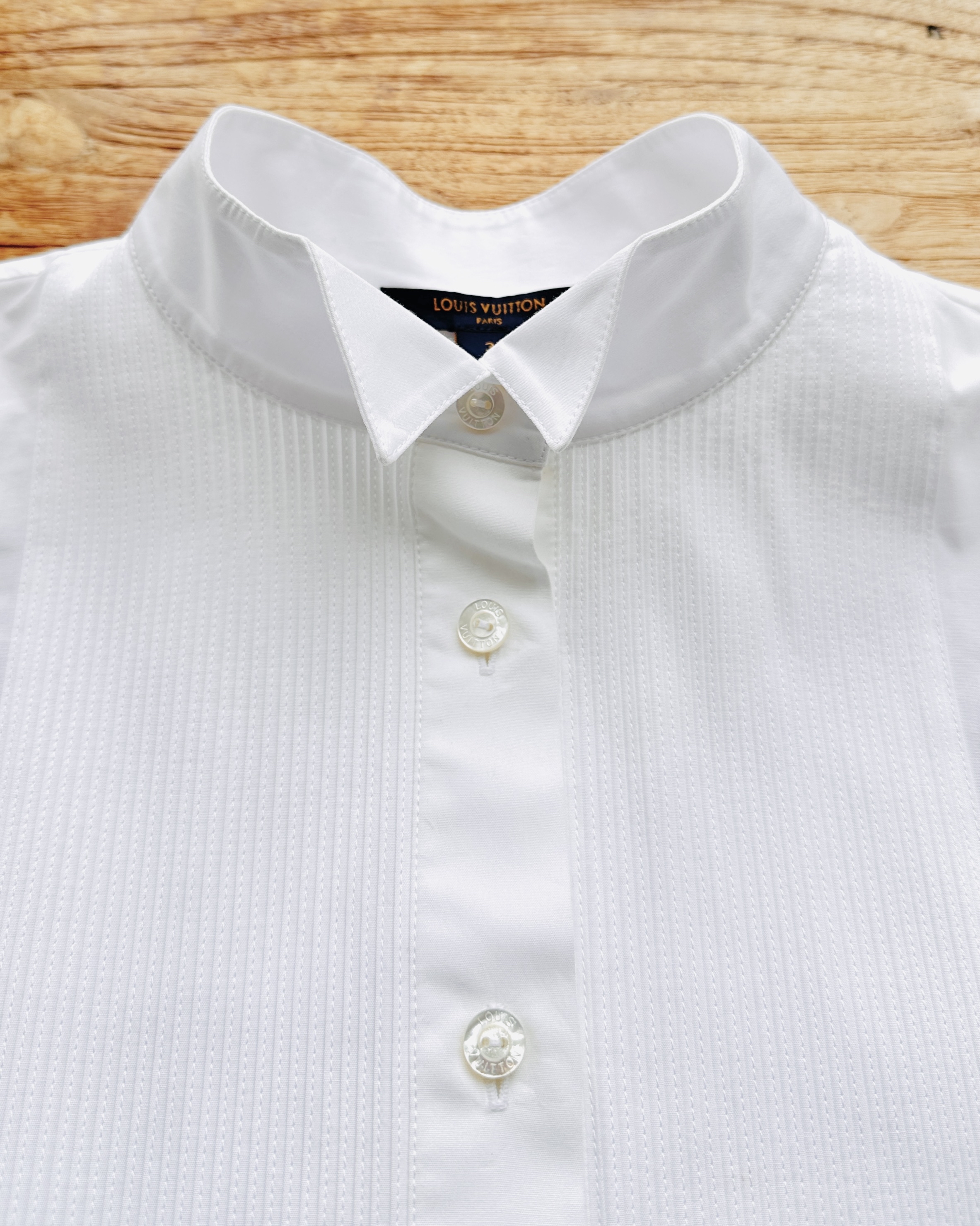 2021原價HK$10K+瀟灑tux shirt。瀟灑在個relaxed fit,即係可以玩Jace Marf Stephy Sammi Man姐式女子漢造型👉🏼硬朗貼服頭+紅唇👄+ tug in + 卷袖 +闊褲耍帥🤺 價錢:HK$2,000 品牌:Louis Vuitton 尺碼:FR 34 / 155/76A / XS 尺寸:47cm (肩)|104cm (胸)|104cm (腰)|55cm (袖)|70cm (前長)|75cm (後長) 註:全新未使用|左袖口唔起眼細粒淡啡漬|100% cotton|95% cotton + 5% polyester| 意大利製 *二手產品難達全新狀態,耗損或歲月痕跡屬正常情況,較明顯/嚴重嘅問題會標明或影底,敬請見諒。 *進入付款程序後,請於10分鐘內完成付款,否則絲統會自動取消訂單。 逢星期四寄出|不設退換或退款|順豐運費到付|只寄香港不寄海外