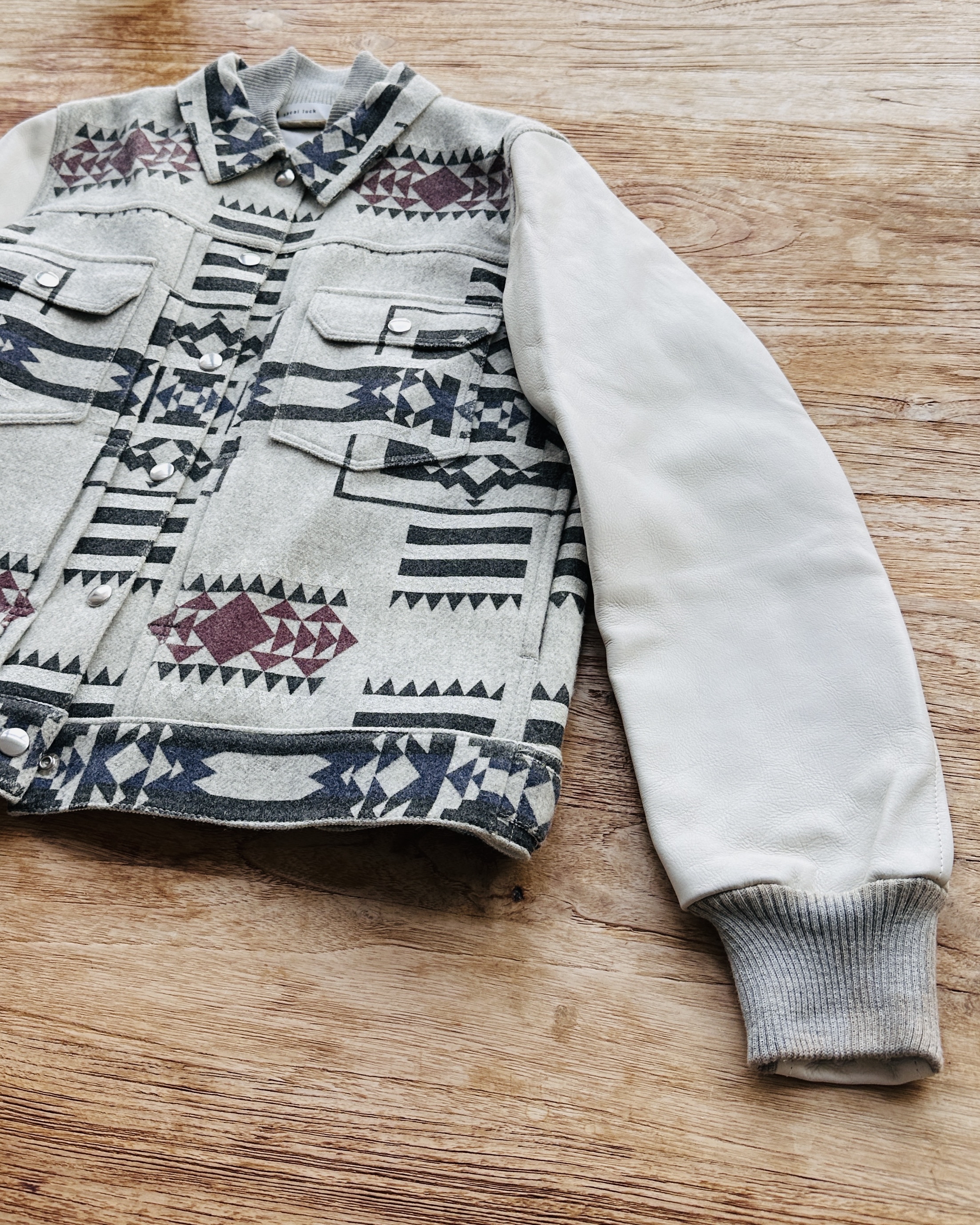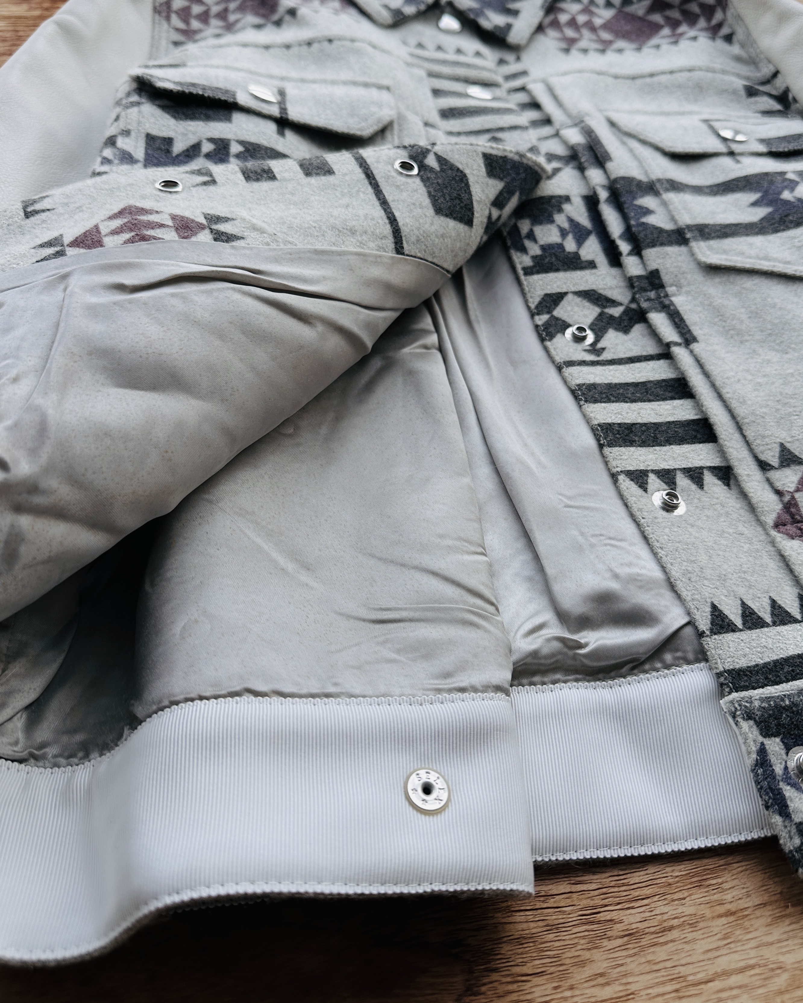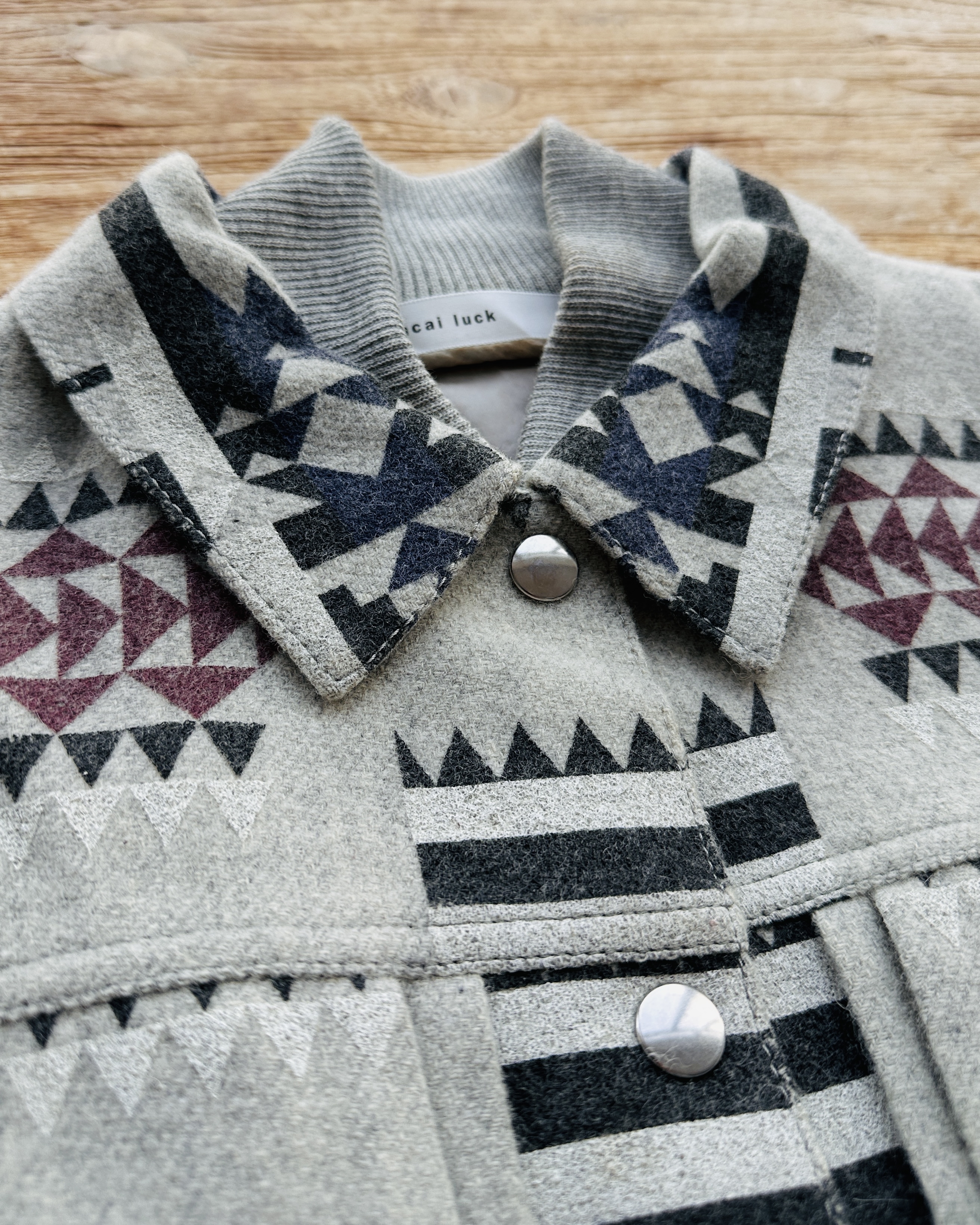 10幾年前Sacai春秋兩季都會以Sacai Luck命名,貌似副線其實又唔算係。呢件2014 pre-fall嘅,好易以為聯乘Pendleton,不過呢兩個單位真正合作要等多5年,呢件純粹要嚟熱吓身🤟🏼。留意衫領同袖口灰色布隨年月有啲變色,不過真身唔算起眼,衫身一啲事都冇🧚🏼♀️ 價錢:HK$750 品牌:Sacai Luck 尺碼:3 / M-L 尺寸:40cm (肩)|108cm (胸-buttoned)|108cm (腰-buttoned)|62cm (袖)|58cm (長) 註:80%新|放耐咗袖口、衫領及內裡布起漬,但唔影響衫身|100% wool|50% cotton + 50% polyester|100% cupro (底)|日本製 *二手產品難達全新狀態,耗損或歲月痕跡屬正常情況,較明顯/嚴重嘅問題會標明或影底,敬請見諒。 *進入付款程序後,請於10分鐘內完成付款,否則絲統會自動取消訂單。 逢星期四寄出|不設退換或退款|順豐運費到付|只寄香港不寄海外