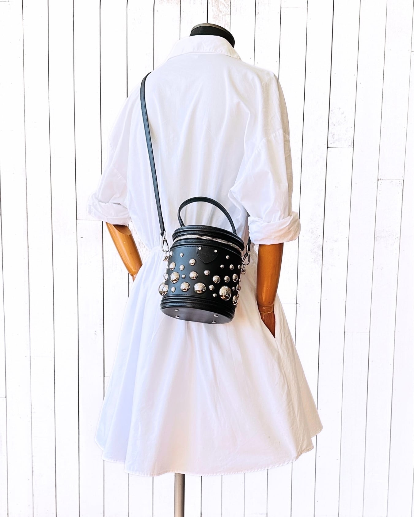 尺寸:15cm (底直徑)|17cm (高)|10cm (袋頂至handle)|52-56cm (袋頂至肩帶-可拆除)