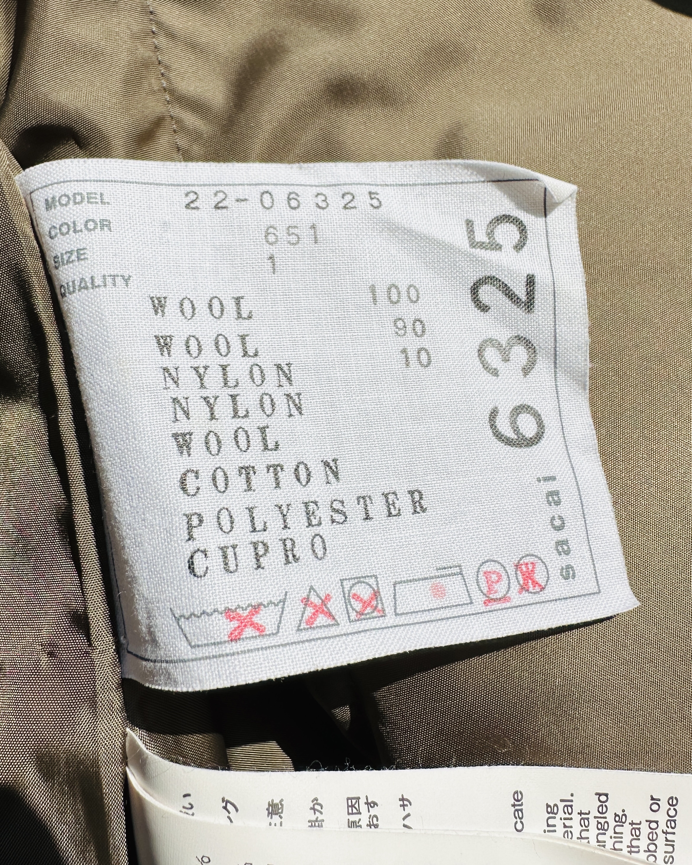 註:85%新|100% wool|90% wool + 10% nylon|100% nylon|100% cupro (底)|日本製
